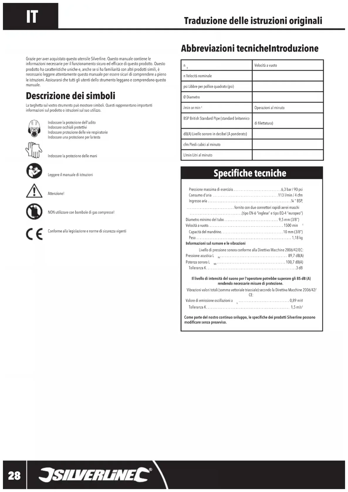 Come parte del nostro continuo sviluppo, le speciche dei prodotti Silverline possono modicare senza preavviso. Abbreviazioni tecnicheIntroduzione Grazie per aver acquistato questo utensile Silverline. Questo manuale contiene le informazioni necessarie per il funzionamento sicuro ed efficace di questo prodotto. Questo prodotto ha caratteristiche uniche e, anche se si ha familiarità con altri prodotti simili, è necessario leggere attentamente questo manuale per essere sicuri di comprendere a pieno le istruzioni. Assicurarsi che tutti gli utenti dello strumento leggano e comprendano questo manuale.