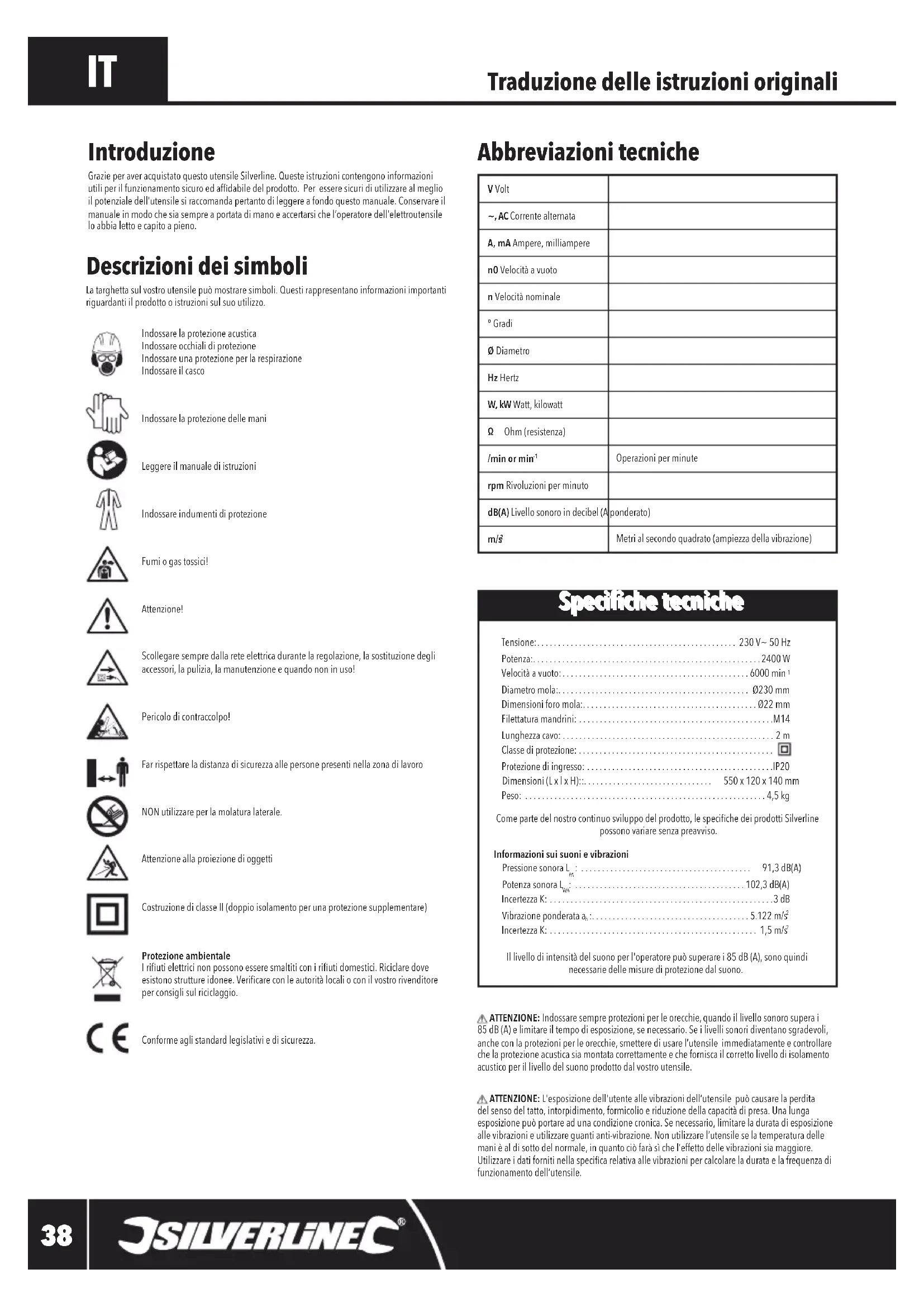 ATTENZIONE: Indossaresempreprotezioniperleorecchie,quandoillivellosonorosuperai 85dB(A)elimitareiltempodiesposizione,senecessario.Seilivellisonoridiventanosgradevoli, anche con la protezioni per le orecchie, smettere di usare l’utensile immediatamente e controllare chelaprotezioneacusticasiamontatacorrettamenteecheforniscailcorrettolivellodiisolamento acusticoperillivellodelsuonoprodottodalvostroutensile. ATTENZIONE:L'esposizionedell'utenteallevibrazionidell’utensilepuòcausarelaperdita delsensodeltatto,intorpidimento,formicolioeriduzionedellacapacitàdipresa.Unalunga esposizionepuòportareadunacondizionecronica.Senecessario,limitareladuratadiesposizione allevibrazionieutilizzareguantianti-vibrazione.Nonutilizzarel’utensileselatemperaturadelle manièaldisottodelnormale,inquantociòfaràsìchel’effettodellevibrazionisiamaggiore. Utilizzareidatifornitinellaspecicarelativaallevibrazionipercalcolareladurataelafrequenzadi funzionamentodell’utensile. Traduzione delle istruzioni originali Abbreviazioni tecniche Descrizioni dei simboli Latarghettasulvostroutensilepuòmostraresimboli.Questirappresentanoinformazioniimportanti riguardantiilprodottooistruzionisulsuoutilizzo. Indossarelaprotezioneacustica Indossareocchialidiprotezione Indossareunaprotezioneperlarespirazione Indossareilcasco Indossarelaprotezionedellemani Leggereilmanualediistruzioni Indossareindumentidiprotezione Fumiogastossici! Attenzione! Scollegare sempre dalla rete elettrica durante la regolazione, la sostituzione degli accessori,lapulizia,lamanutenzioneequandononinuso! Pericolodicontraccolpo! Farrispettareladistanzadisicurezzaallepersonepresentinellazonadilavoro NONutilizzareperlamolaturalaterale. Attenzione alla proiezione di oggetti CostruzionediclasseII(doppioisolamentoperunaprotezionesupplementare) Protezione ambientale Iriutielettricinonpossonoesseresmaltiticoniriutidomestici.Riciclaredove esistonostruttureidonee.Vericareconleautoritàlocalioconilvostrorivenditore perconsiglisulriciclaggio. Conformeaglistandardlegislativiedisicurezza. Introduzione GrazieperaveracquistatoquestoutensileSilverline.Questeistruzionicontengonoinformazioni utiliperilfunzionamentosicuroedafdabiledelprodotto.Peresseresicuridiutilizzarealmeglio ilpotenzialedell’utensilesiraccomandapertantodileggereafondoquestomanuale.Conservareil manuale in modo che sia sempre a portata di mano e accertarsi che l’operatore dell’elettroutensile loabbialettoecapitoapieno. Speciche tecniche