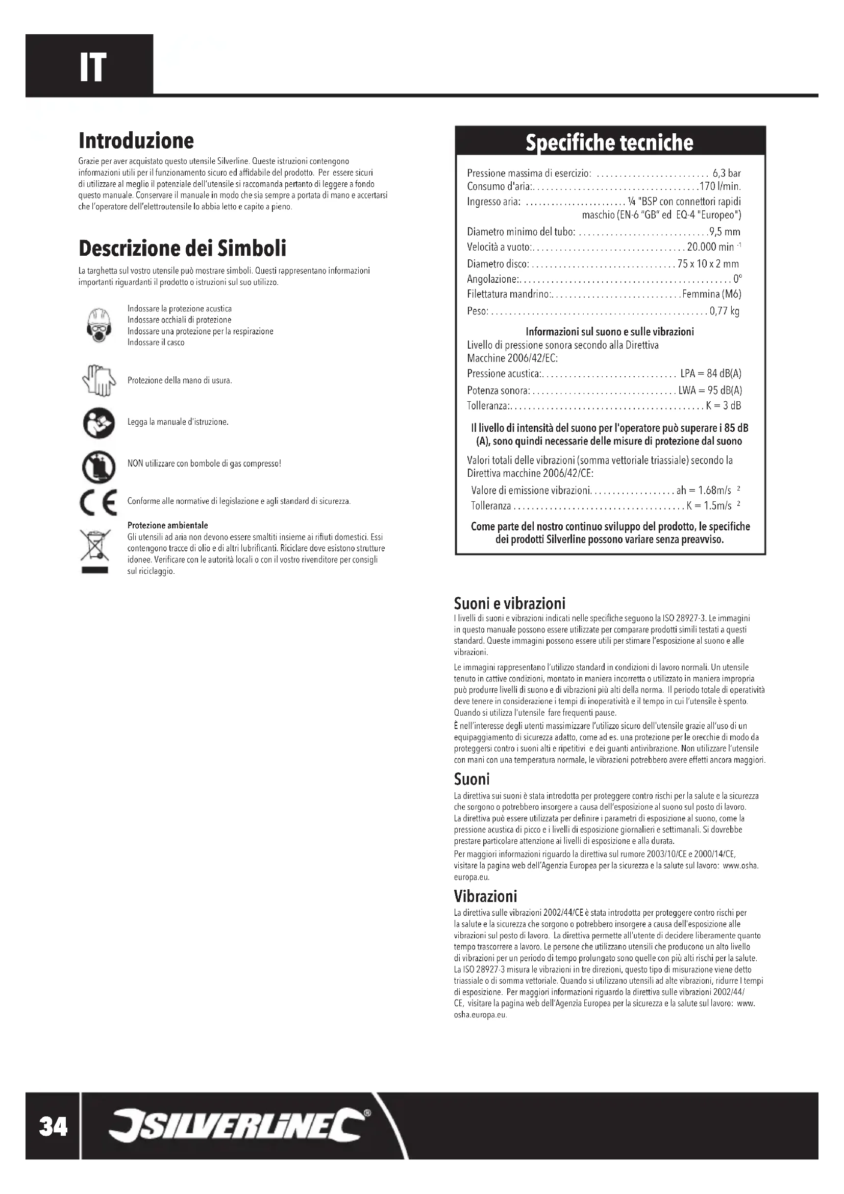 Conforme alle normative di legislazione e agli standard di sicurezza.Protezione ambientale Gli utensili ad aria non devono essere smaltiti insieme ai riuti domestici. Essi contengono tracce di olio e di altri lubricanti. Riciclare dove esistono strutture idonee. Vericare con le autorità locali o con il vostro rivenditore per consigli sul riciclaggio. Introduzione Grazie per aver acquistato questo utensile Silverline. Queste istruzioni contengono informazioni utili per il funzionamento sicuro ed afdabile del prodotto. Per essere sicuri di utilizzare al meglio il potenziale dell’utensile si raccomanda pertanto di leggere a fondo questo manuale. Conservare il manuale in modo che sia sempre a portata di mano e accertarsi che l’operatore dell’elettroutensile lo abbia letto e capito a pieno. Speciche tecniche 598446_Z1MANPRO1.indd 34 15/02/2017 12:41Utensile da taglio pneumatico 598446