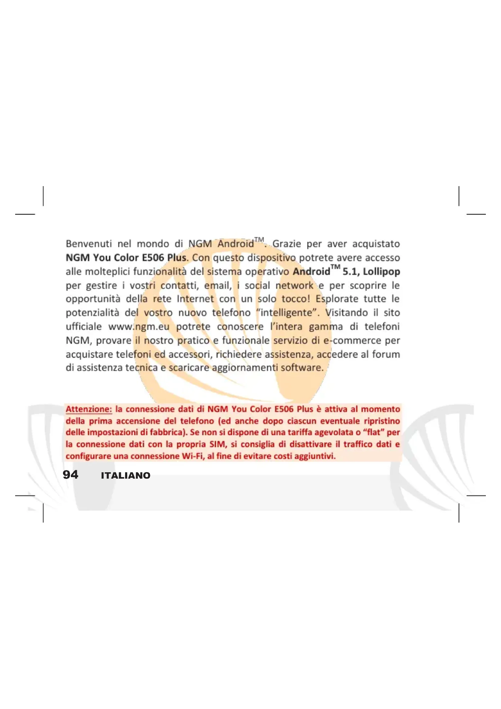 . Grazie per aver acquistato NGM You Color E506 Plus. Con questo dispositivo potrete avere accesso alle molteplici funzionalità del sistema operativo Android