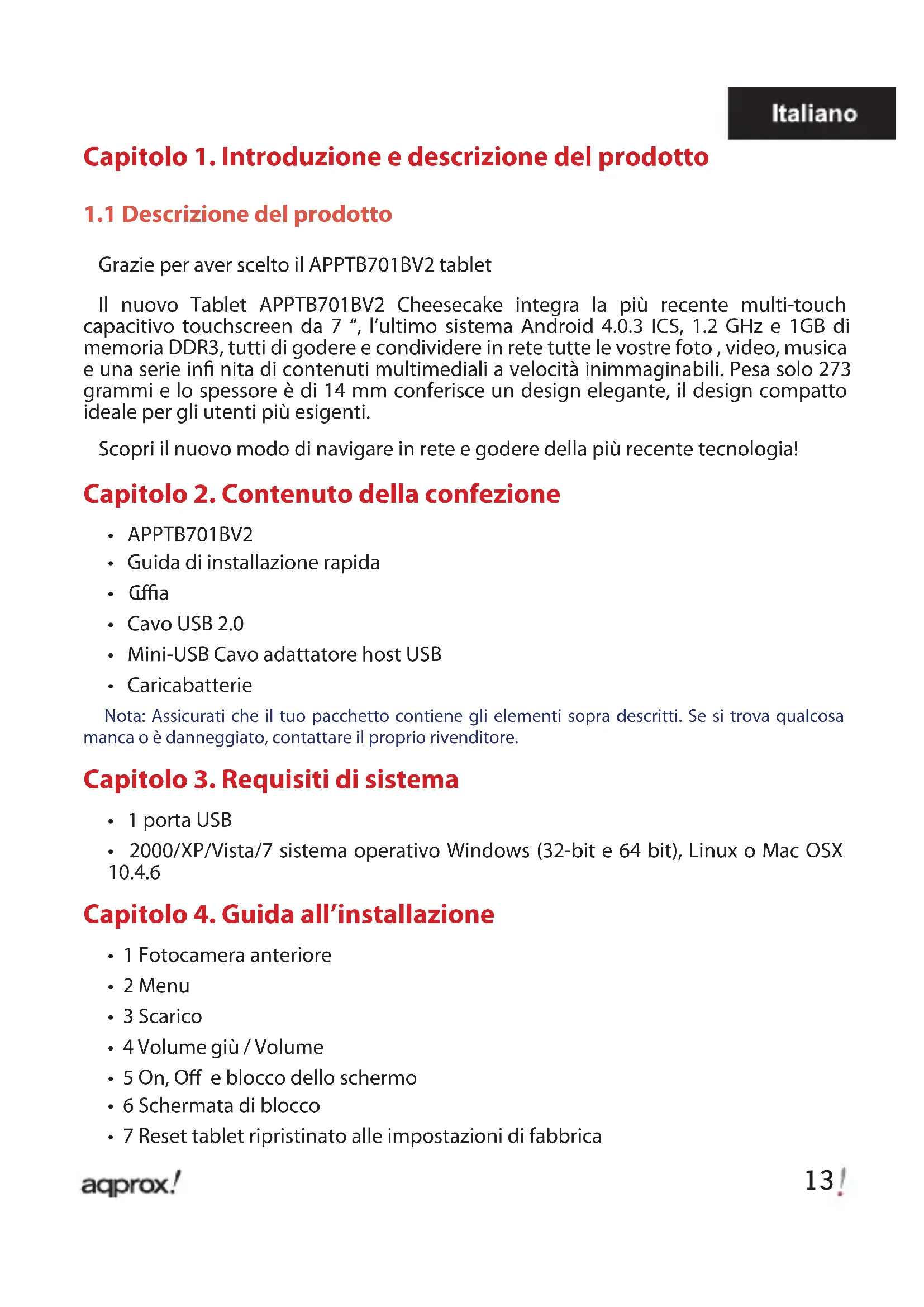 Scarica le istruzioni per il tuo Tablet in formato PDF gratuitamente! Trova il tuo manuale appTB701BV2 - Aqprox e riprendi in mano il tuo dispositivo elettronico. In questa pagina sono pubblicati tutti i documenti necessari per l'utilizzo del tuo dispositivo. appTB701BV2 del marchio Aqprox.
