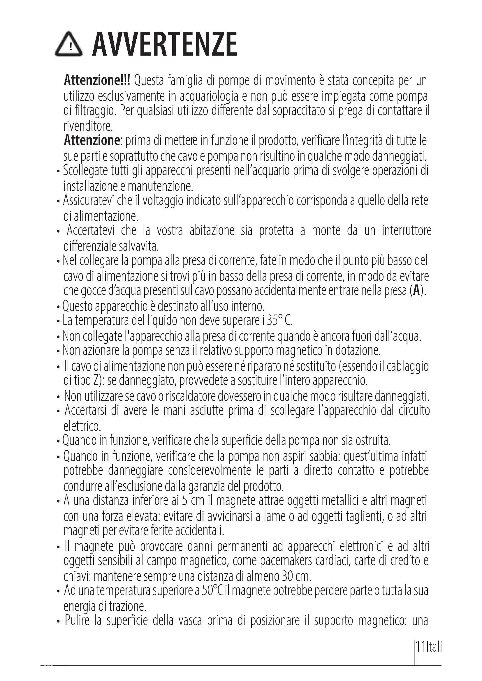 AVVERTENZE Attenzione!!! Questa famiglia di pompe di movimento è stata concepita per un utilizzo esclusivamente in acquariologia e non può essere impiegata come pompa di filtraggio. Per qualsiasi utilizzo differente dal sopraccitato si prega di contattare il rivenditore. Attenzione: prima di mettere in funzione il prodotto, verificare l’integrità di tutte le sue parti e soprattutto che cavo e pompa non risultino in qualche modo danneggiati.