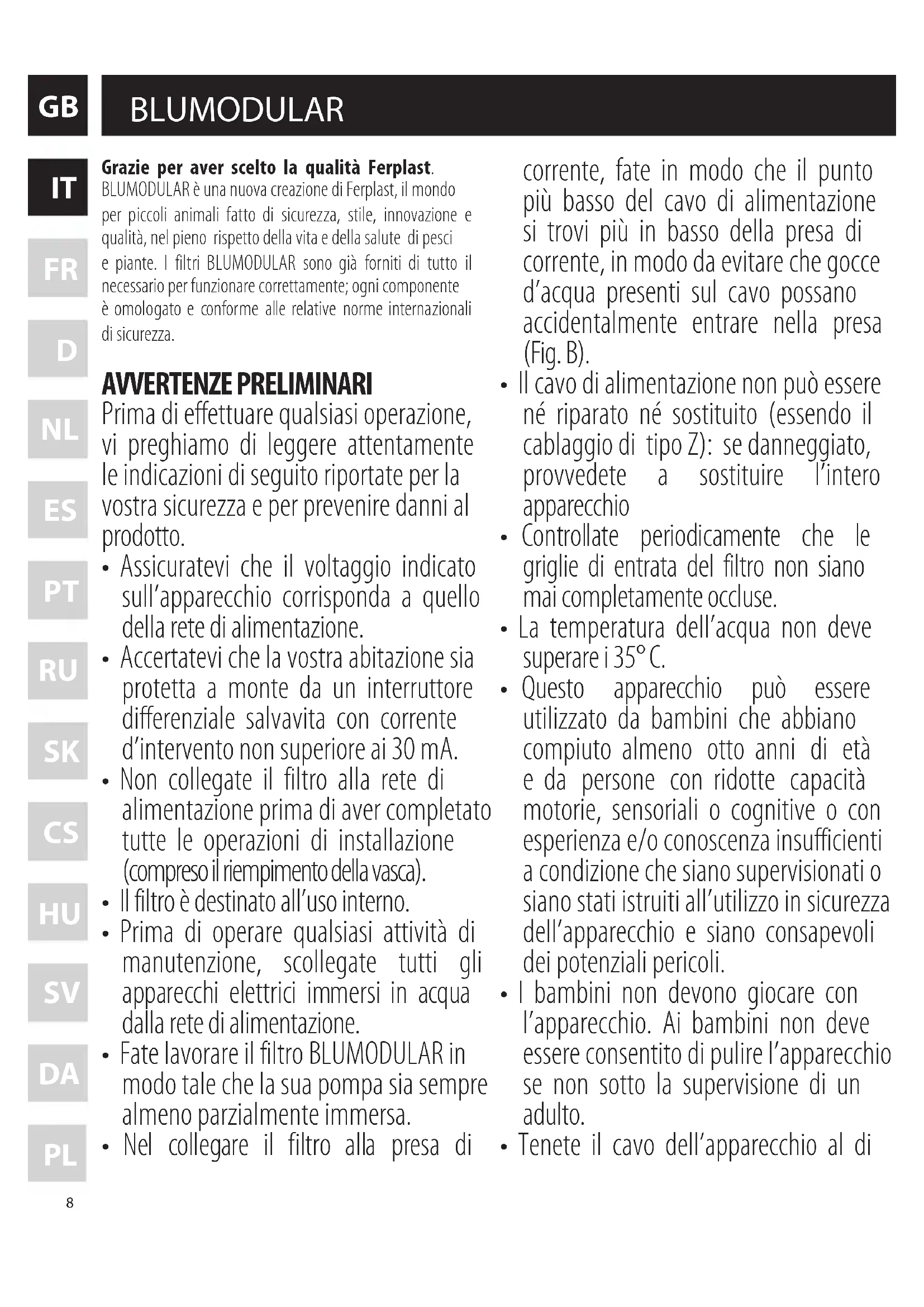 Grazie per aver scelto la qualità Ferplast. BLUMODULAR è una nuova creazione di Ferplast, il mondo per piccoli animali fatto di sicurezza, stile, innovazione e qualità, nel pieno rispetto della vita e della salute di pesci e piante. I filtri BLUMODULAR sono già forniti di tutto il necessario per funzionare correttamente; ogni componente è omologato e conforme alle relative norme internazionali di sicurezza. AVVERTENZE PRELIMINARI Prima di effettuare qualsiasi operazione, vi preghiamo di leggere attentamente le indicazioni di seguito riportate per la vostra sicurezza e per prevenire danni al prodotto.