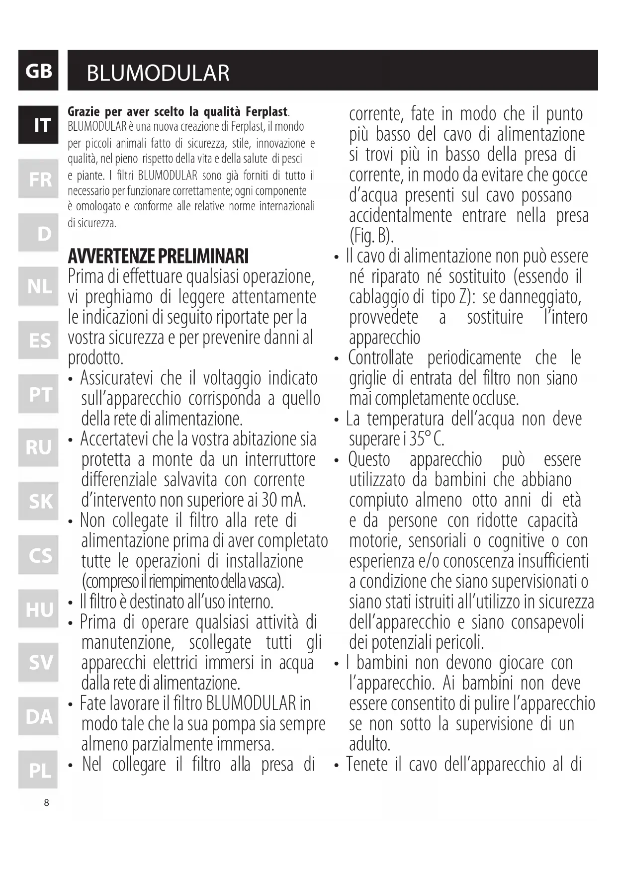 Grazie per aver scelto la qualità Ferplast. BLUMODULAR è una nuova creazione di Ferplast, il mondo per piccoli animali fatto di sicurezza, stile, innovazione e qualità, nel pieno rispetto della vita e della salute di pesci e piante. I filtri BLUMODULAR sono già forniti di tutto il necessario per funzionare correttamente; ogni componente è omologato e conforme alle relative norme internazionali di sicurezza. AVVERTENZE PRELIMINARI Prima di effettuare qualsiasi operazione, vi preghiamo di leggere attentamente le indicazioni di seguito riportate per la vostra sicurezza e per prevenire danni al prodotto.