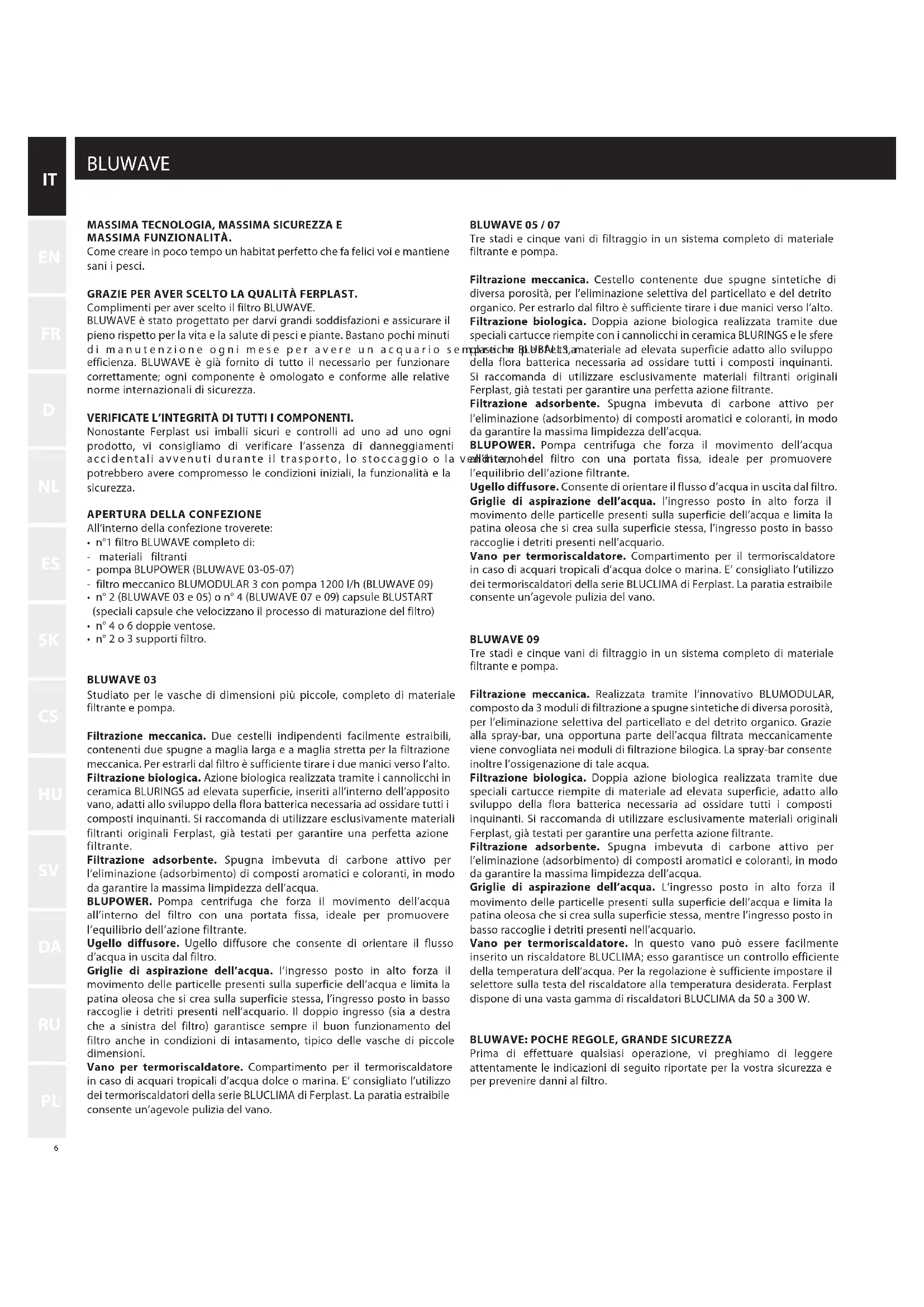 IMPORTANTE • Non bisogna risciacquare i materiali biologici, perciò non estraeteli mai dal filtro, in modo che conservino intatte le associazioni batteriche che li rendono attivi.• Nel caso in cui riteniate utile sostituire i materiali biologici con altri di tipo diverso, operate separatamente sulle due cartucce a distanza di almeno 2-3 settimane (filtri BLUWAVE 05, 07 e 09).• Usate solo ricambi originali Ferplast per la sostituzione di qualsiasi componente del filtro. L’uso di ricambi non originali rende nulla la garanzia.• Presso il vostro rivenditore sono disponibili i ricambi BLURINGS e BLUBALLS.BLUWAVE: parametri dell’acqua sempre sotto controlloIl filtro BLUWAVE assicura automaticamente le migliori condizioni per la vita di pesci e piante perché il controlla perfettamente tutti i valori dell’acqua.L’acqua dell’acquario è infatti una soluzione complessa, definita da numerose ‘misure’ chimiche e fisiche: temperatura, livello di acidità (pH), durezza totale e carbonatica (GH, KH), contenuto in sostanze inquinanti (PO