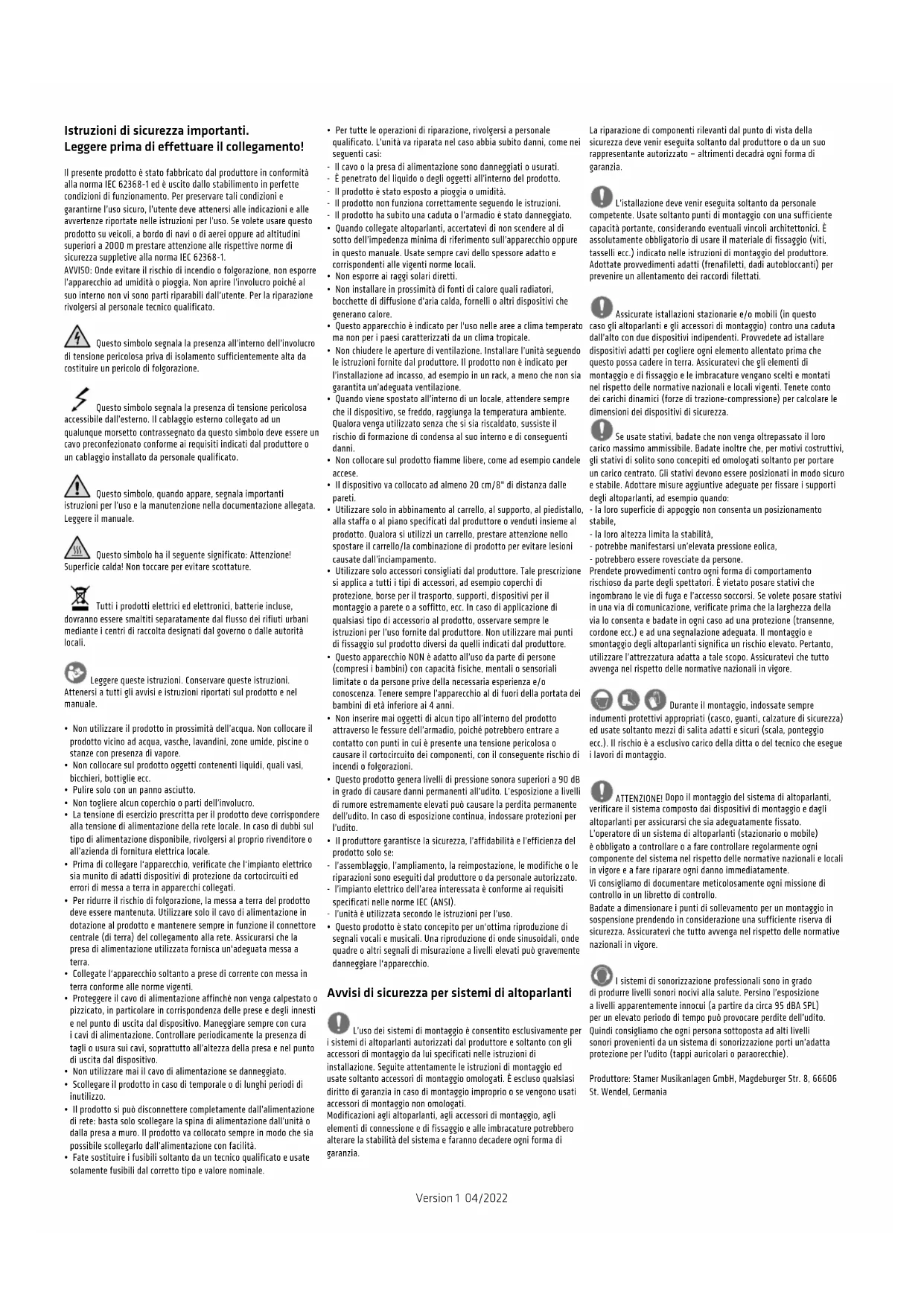 La riparazione di componenti rilevanti dal punto di vista della sicurezza deve venir eseguita soltanto dal produttore o da un suo rappresentante autorizzato – altrimenti decadrà ogni forma di garanzia. L’istallazione deve venir eseguita soltanto da personale competente. Usate soltanto punti di montaggio con una sufficiente capacità portante, considerando eventuali vincoli architettonici. È assolutamente obbligatorio di usare il materiale di fissaggio (viti, tasselli ecc.) indicato nelle istruzioni di montaggio del produttore. Adottate provvedimenti adatti (frenafiletti, dadi autobloccanti) per prevenire un allentamento dei raccordi filettati. Assicurate istallazioni stazionarie e/o mobili (in questo caso gli altoparlanti e gli accessori di montaggio) contro una caduta dall’alto con due dispositivi indipendenti. Provvedete ad istallare dispositivi adatti per cogliere ogni elemento allentato prima che questo possa cadere in terra. Assicuratevi che gli elementi di montaggio e di fissaggio e le imbracature vengano scelti e montati nel rispetto delle normative nazionali e locali vigenti. Tenete conto dei carichi dinamici (forze di trazione-compressione) per calcolare le dimensioni dei dispositivi di sicurezza. Se usate stativi, badate che non venga oltrepassato il loro carico massimo ammissibile. Badate inoltre che, per motivi costruttivi, gli stativi di solito sono concepiti ed omologati soltanto per portare un carico centrato. Gli stativi devono essere posizionati in modo sicuro e stabile. Adottare misure aggiuntive adeguate per fissare i supporti degli altoparlanti, ad esempio quando: - la loro superficie di appoggio non consenta un posizionamento stabile, - la loro altezza limita la stabilità, - potrebbe manifestarsi un’elevata pressione eolica, - potrebbero essere rovesciate da persone. Prendete provvedimenti contro ogni forma di comportamento rischioso da parte degli spettatori. È vietato posare stativi che ingombrano le vie di fuga e l’accesso soccorsi. Se volete posare stativi in una via di comunicazione, verificate prima che la larghezza della via lo consenta e badate in ogni caso ad una protezione (transenne, cordone ecc.) e ad una segnalazione adeguata. Il montaggio e smontaggio degli altoparlanti significa un rischio elevato. Pertanto, utilizzare l’attrezzatura adatta a tale scopo. Assicuratevi che tutto avvenga nel rispetto delle normative nazionali in vigore. Durante il montaggio, indossate sempre indumenti protettivi appropriati (casco, guanti, calzature di sicurezza) ed usate soltanto mezzi di salita adatti e sicuri (scala, ponteggio ecc.). Il rischio è a esclusivo carico della ditta o del tecnico che esegue i lavori di montaggio. ATTENZIONE! Dopo il montaggio del sistema di altoparlanti, verificare il sistema composto dai dispositivi di montaggio e dagli altoparlanti per assicurarsi che sia adeguatamente fissato. L’operatore di un sistema di altoparlanti (stazionario o mobile) è obbligato a controllare o a fare controllare regolarmente ogni componente del sistema nel rispetto delle normative nazionali e locali in vigore e a fare riparare ogni danno immediatamente. Vi consigliamo di documentare meticolosamente ogni missione di controllo in un libretto di controllo. Badate a dimensionare i punti di sollevamento per un montaggio in sospensione prendendo in considerazione una sufficiente riserva di sicurezza. Assicuratevi che tutto avvenga nel rispetto delle normative nazionali in vigore. I sistemi di sonorizzazione professionali sono in grado di produrre livelli sonori nocivi alla salute. Persino l’esposizione a livelli apparentemente innocui (a partire da circa 95dBASPL) per un elevato periodo di tempo può provocare perdite dell’udito. Quindi consigliamo che ogni persona sottoposta ad alti livelli sonori provenienti da un sistema di sonorizzazione porti un’adatta protezione per l’udito (tappi auricolari o paraorecchie). Produttore: Stamer Musikanlagen GmbH, Magdeburger Str. 8, 66606 St. Wendel, GermaniaPOLAR 8 1.0