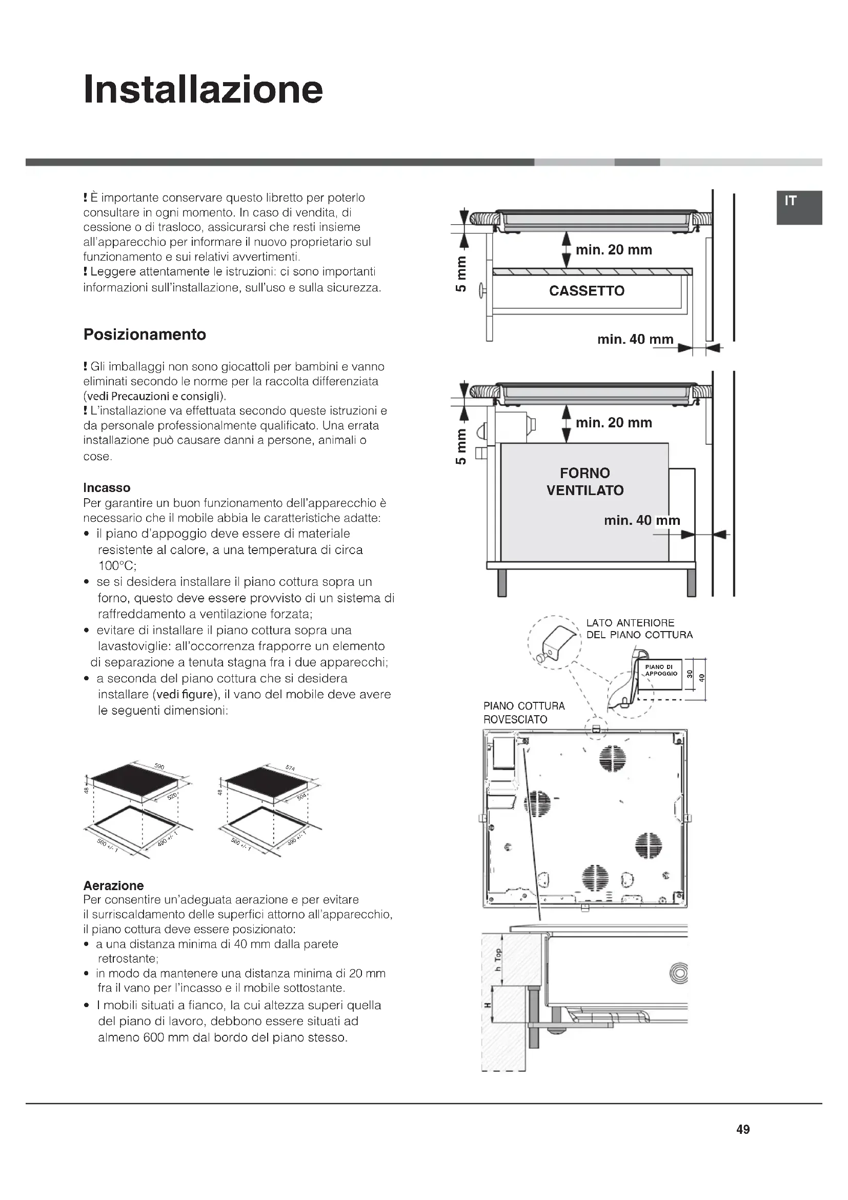 Installazione ! È importante conservare questo libretto per poterlo consultare in ogni momento. In caso di vendita, di cessione o di trasloco, assicurarsi che resti insieme all’apparecchio per informare il nuovo proprietario sul funzionamento e sui relativi avvertimenti. ! Leggere attentamente le istruzioni: ci sono importanti informazioni sull’installazione, sull’uso e sulla sicurezza. Posizionamento ! Gli imballaggi non sono giocattoli per bambini e vanno eliminati secondo le norme per la raccolta differenziata (vedi Precauzioni e consigli). ! L’installazione va effettuata secondo queste istruzioni e da personale professionalmente qualificato. Una errata installazione può causare danni a persone, animali o cose. Incasso Per garantire un buon funzionamento dell’apparecchio è necessario che il mobile abbia le caratteristiche adatte: