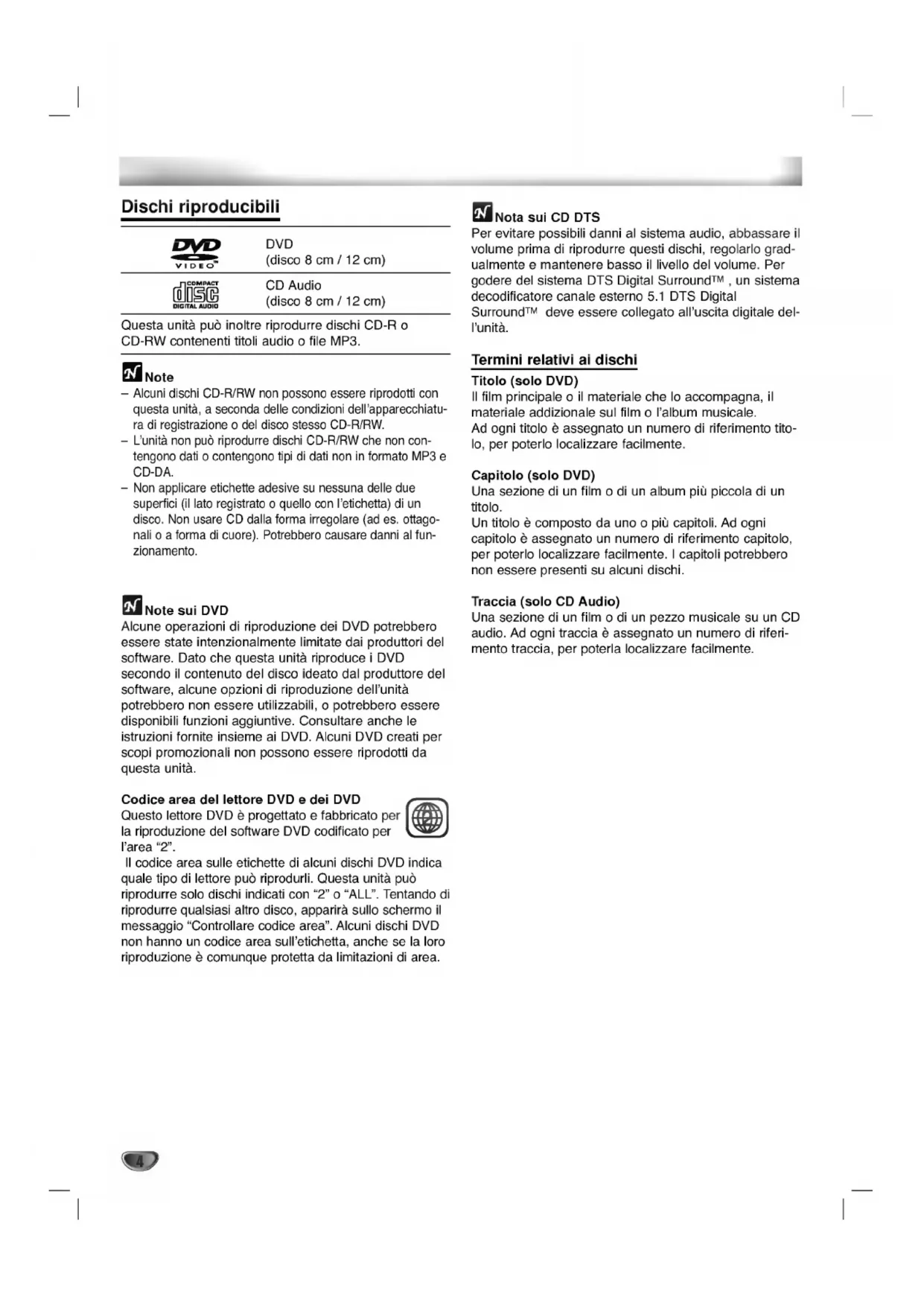 potrebbero essere disponibilifunzioniaggiuntive.ConsultareancheleistruzioniforniteinsiemeaiDVD.AlcuniDVDcreatiperscopipromozionali non possono essere riprodottidaquestaunit .Codice area dellettoreDVD deiDVDQuestolettoreDVDprogettato fabbricatoperlariproduzionedelsoftwareDVDcodificatoperl'area"2".Ilcodice area sulleetichettedialcunidischiDVDindicaqualetipodilettore riprodurli.Questaunit riprodurresolodischiindicati con "2" "ALL".Tentandodiriprodurrequalsiasialtro disco, apparir sulloschermoilmessaggio"Controllarecodicearea".AlcunidischiDVD non hanno codice area sull'etichetta, anche lalororiproduzionecomunqueprotettadalimitazionidi area. NotasuiCDDTSPerevitarepossibilidannialsistema audio, abbassareilvolumeprimadiriprodurrequesti dischi, regolarlograd-ualmente