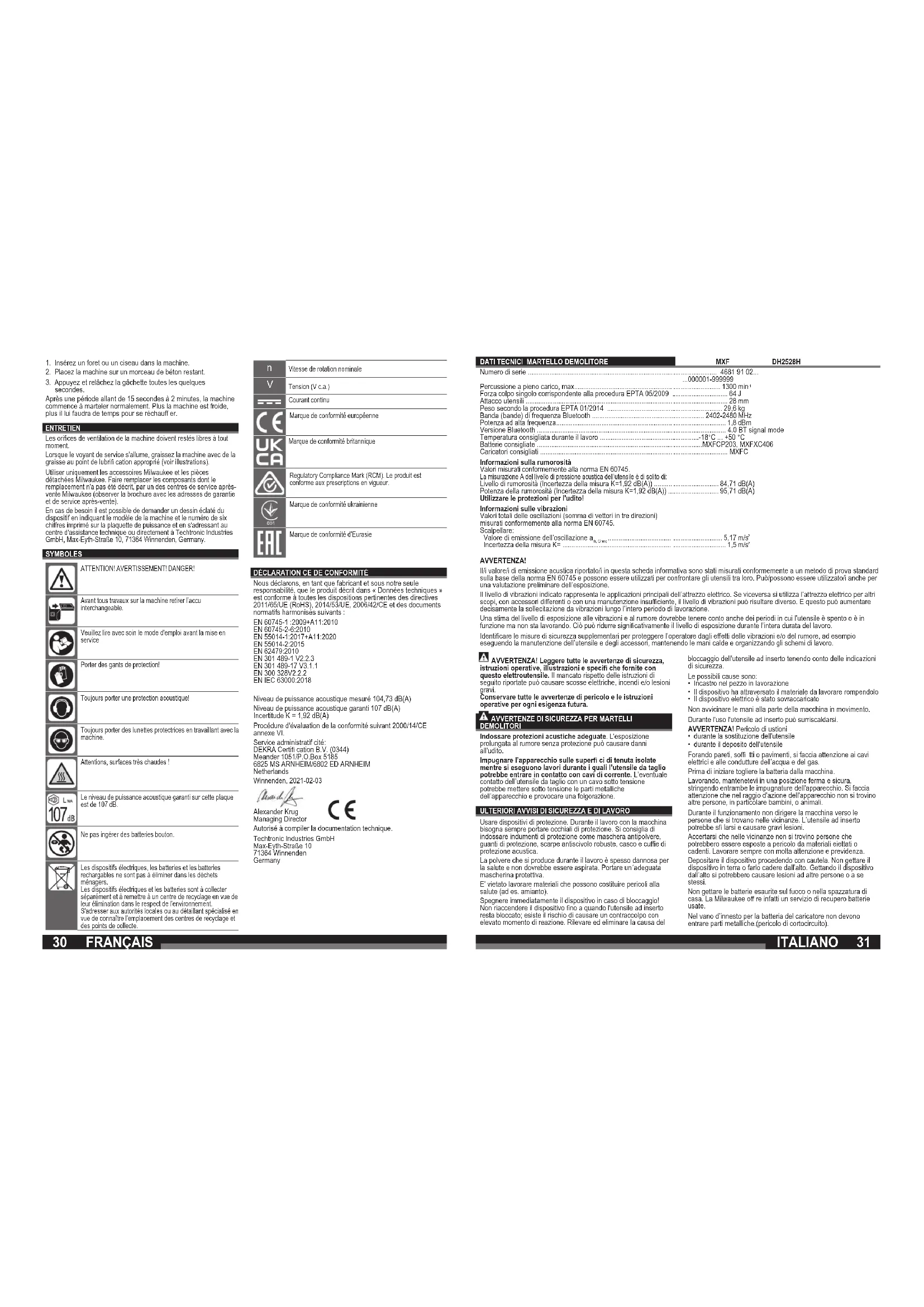Netherlands Winnenden, 2021-02-03 Alexander Krug Managing Director Autorizzato alla preparazione della documentazione tecnica Techtronic Industries GmbH Max-Eyth-Straße 10 71364 Winnenden Germany ITALIANO Utilizzare solo caricabatterie MXF per caricare le batterie ricaricabili MXF. Non utilizzare batterie ricaricabili di altri sistemi. Non aprire nè la batteria nè il caricatore e conservarli solo in luogo asciutto. Proteggerli dalla umidità. Nel caso di batterie danneggiate da un carico eccessivo o da temperature alte, l'acido di queste potrebbe fuoriuscire. In caso di contatto con l'acido delle batterie lavarsi immediatamente con acqua e sapone. In caso di contatto con gli occhi risciacquare immediatamente con acqua per almeno 10 minuti e contattare subito un medico. Attenzione! Per ridurre il rischio d'incendio, di lesioni o di danni al prodotto causati da corto circuito, non immergere mai l'utensile, la batteria ricaricabile o il carica batterie in un liquido e non lasciare mai penetrare alcun liquido all'interno dei dispositivi e delle batterie. I fl uidi corrosivi o conduttori come acqua salata, alcuni agenti chimici, agenti candeggianti o prodotti contenenti agenti candeggianti potrebbero provocare un corto circuito. AVVERTENZA! Questo dispositivo contiene una batteria a bottone al litio. Una batteria nuova o usata può causare gravi ustioni interne e indurre la morte in meno di 2 ore se viene ingerita o se entra all’interno del corpo. Chiudere sempre in sicurezza il coperchio del vano batteria. Se non chiude in sicurezza, spegnere il dispositivo, rimuovere la batteria e conservarla fuori dalla portata dei bambini. Se si ha il sospetto che possano essere state ingoiate delle batterie o che queste possano essere entrate nel corpo, consultare immediatamente un medico. UTILIZZO CONFORME Il martello può essere utilizzato per scalpellare la pietra e cemento. Utilizzare il prodotto solo per l’uso per cui è previsto.
