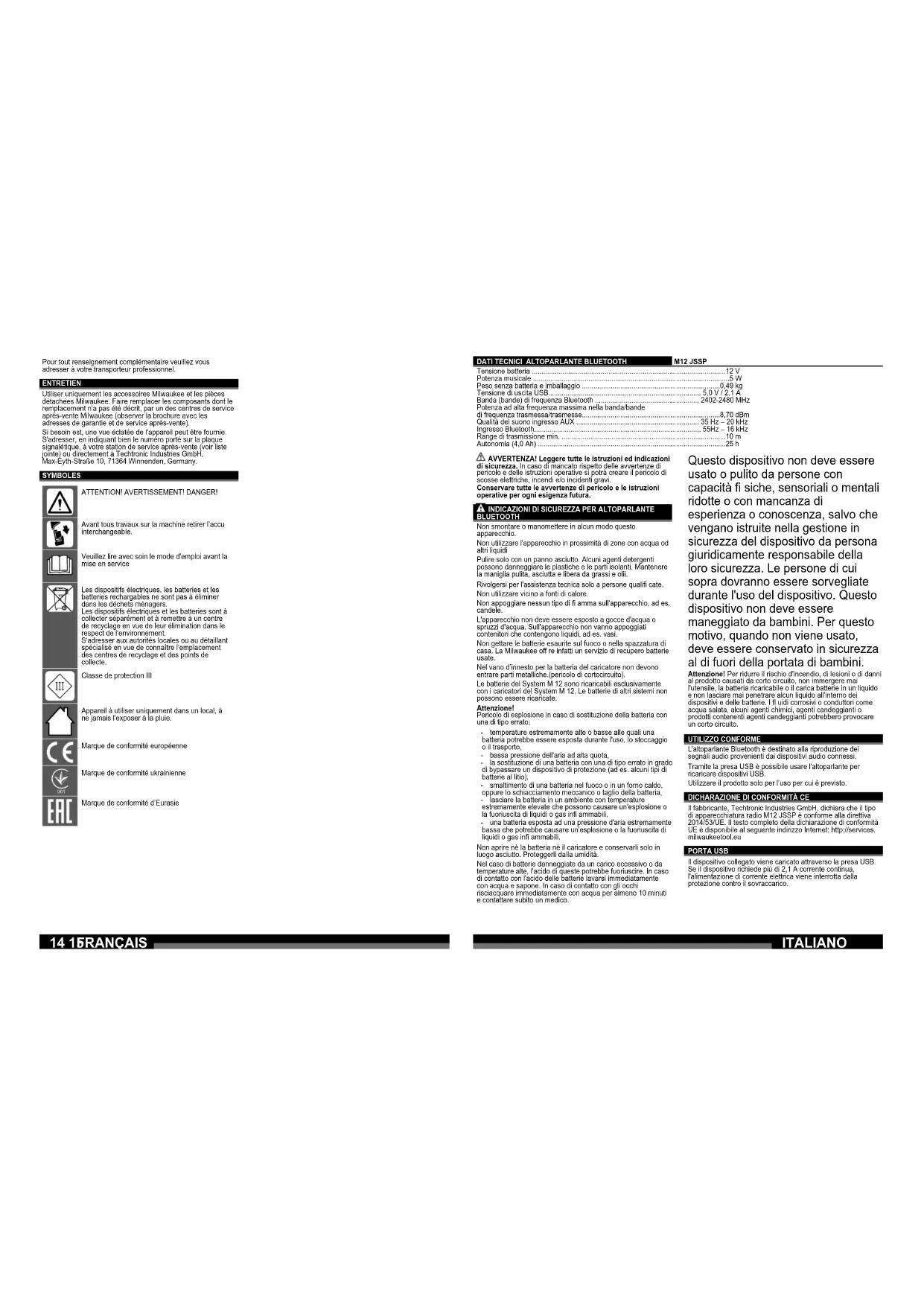 - Batterie danneggiate o batterie che perdono liquido non devono essere trasportate. Per ulteriori informazioni si prega di contattare il proprio trasportatore. MANUTENZIONE Usare solo accessori Milwaukee e pezzi di ricambio Milwaukee. Gruppi costruttivi la cui sostituzione non è stata descritta, devono essere fatti cambiare da un punto di servizio di assistenza tecnica al cliente Milwaukee (vedi depliant garanzia/ indirizzi assistenza tecnica ai clienti). In caso di mancanza del disegno esploso, può essere richiesto al seguente indirizzo: Techtronic Industries GmbH, Max-Eyth-Straße 10, 71364 Winnenden, Germany. SIMBOLI ATTENZIONE! AVVERTENZA! PERICOLO! Prima di iniziare togliere la batteria dalla macchina. Leggere attentamente le istruzioni per l'uso prima di mettere in funzione l'elettroutensile. I dispositivi elettrici, le batterie e le batterie ricaricabili non devono essere smaltiti con i rifi uti domestici. I dispositivi elettrici e le batterie devono essere raccolti separatamente e devono essere conferiti ad un centro di riciclaggio per lo smaltimento rispettoso dell‘ambiente. Chiedere alle autorità locali o al rivenditore specializzato dove si trovano i centri di riciclaggio e i punti di raccolta. Classe di protezione III Apparecchio da utilizzare esclusivamente in luogo chiuso, e comunque non esposto a pioggia. Marchio di conformità europeo Marchio di conformità ucraino Marchio di conformità euroasiatico18 19 M12 JSSP .............................12 V ...............................5 W ..........................0,49 kg ................ 5,0 V / 2,1 A ............... 2402-2480 MHz ..........................8,70 dBm ............... 35 Hz – 20 kHz ................ 55Hz – 16 kHz .............................10 m .............................25 h ESPAÑOL