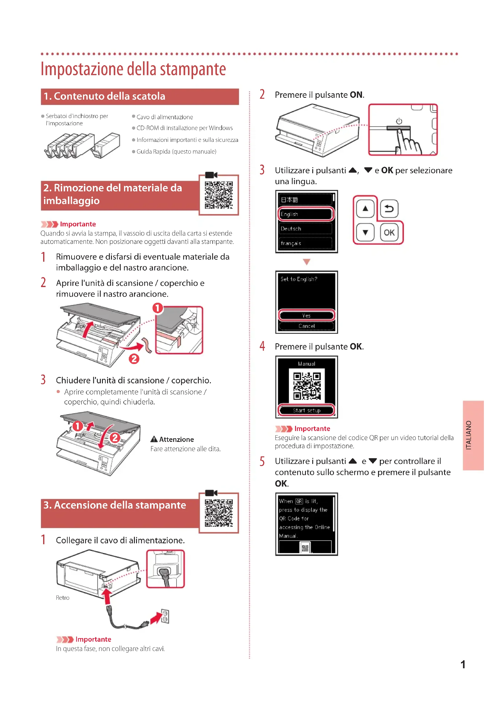 Serbatoi d'inchiostro per l'impostazione Cavo di alimentazione CD-ROM di installazione per Windows Informazioni importanti e sulla sicurezza Guida Rapida (questo manuale)