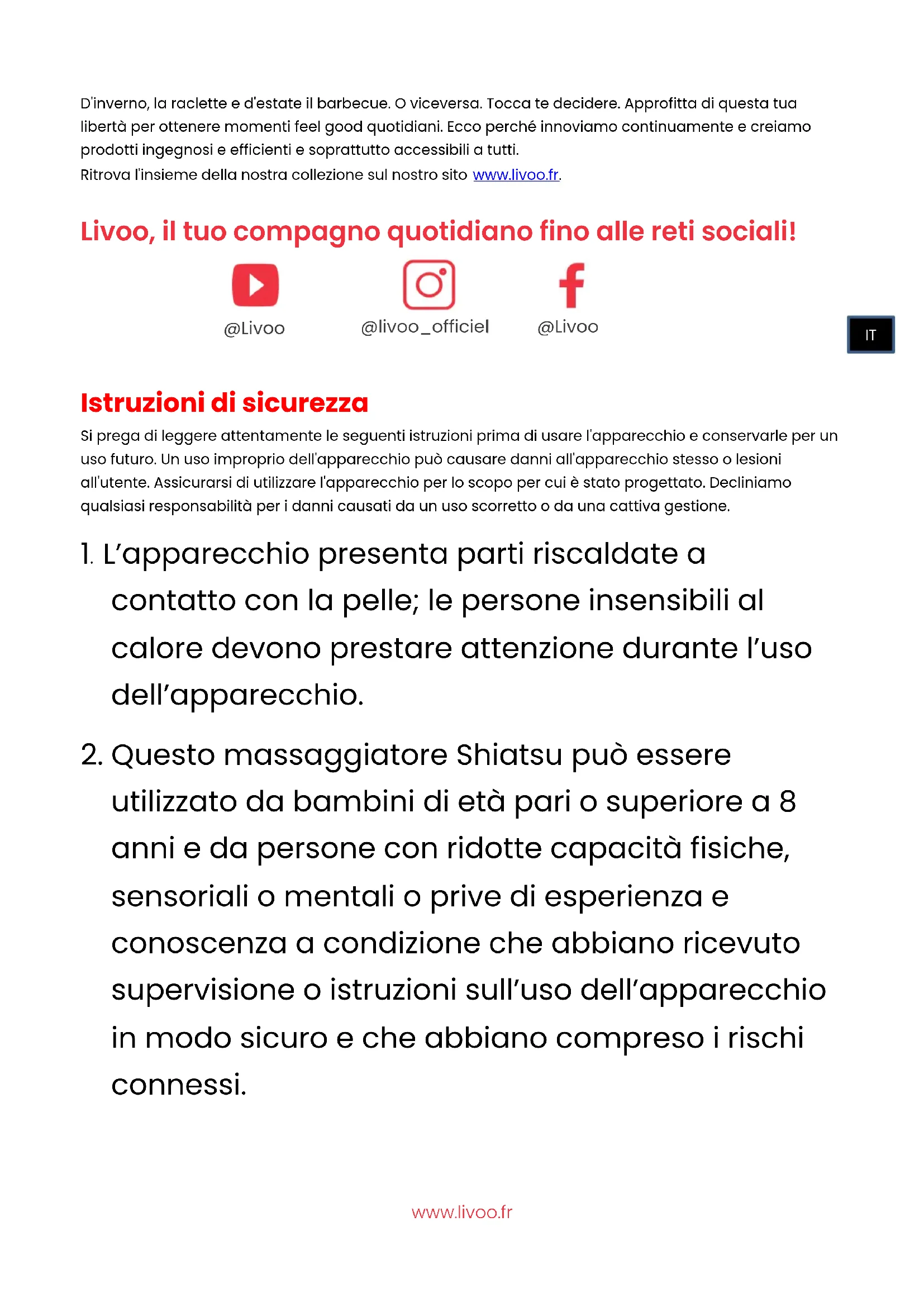 controllato regolarmente per verificare la presenza di eventuali segni di usura o danni. Se il ITwww.livoo.fr massaggiatore Shiatsu è usato in modo improprio o se si riscalda di più, deve essere controllato dal produttore prima di essere usato di nuovo.