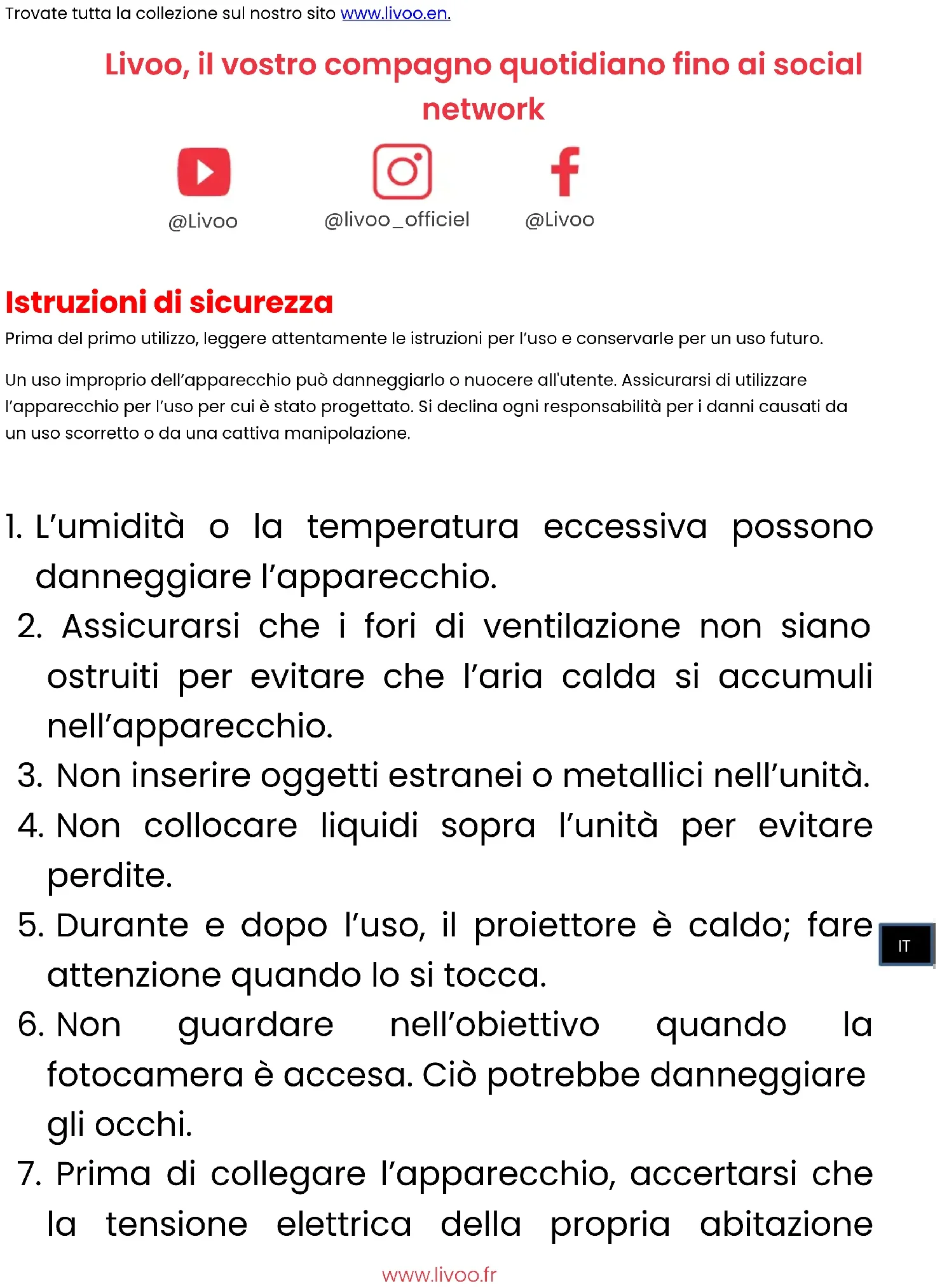 Grazie per aver scelto un prodotto Livoo! Il vostro frullatore, il vostro barbecue e le vostre cuffie non sono solo degli oggetti ma delle estensioni di voi stessi, che vi permettono di avvicinarvi ai vostri amici e alla vostra famiglia, di riunirli, di ridere e di condividere esperienze. L’obiettivo di Livoo è di aiutarvi a vivere al meglio la vostra vita, qualunque sia il vostro desiderio durante l’anno. Raclette invernale, barbecue estivo. O il contrario. Sta a voi decidere. Approfittate di questa libertà per vivere momenti felici ogni giorno. Ecco perché innoviamo costantemente e creiamo prodotti intelligenti e pieni di brio, ma soprattutto accessibili. ITwww.livoo.fr Trovate tutta la collezione sul nostro sito www.livoo.en. Livoo, il vostro compagno quotidiano fino ai social network