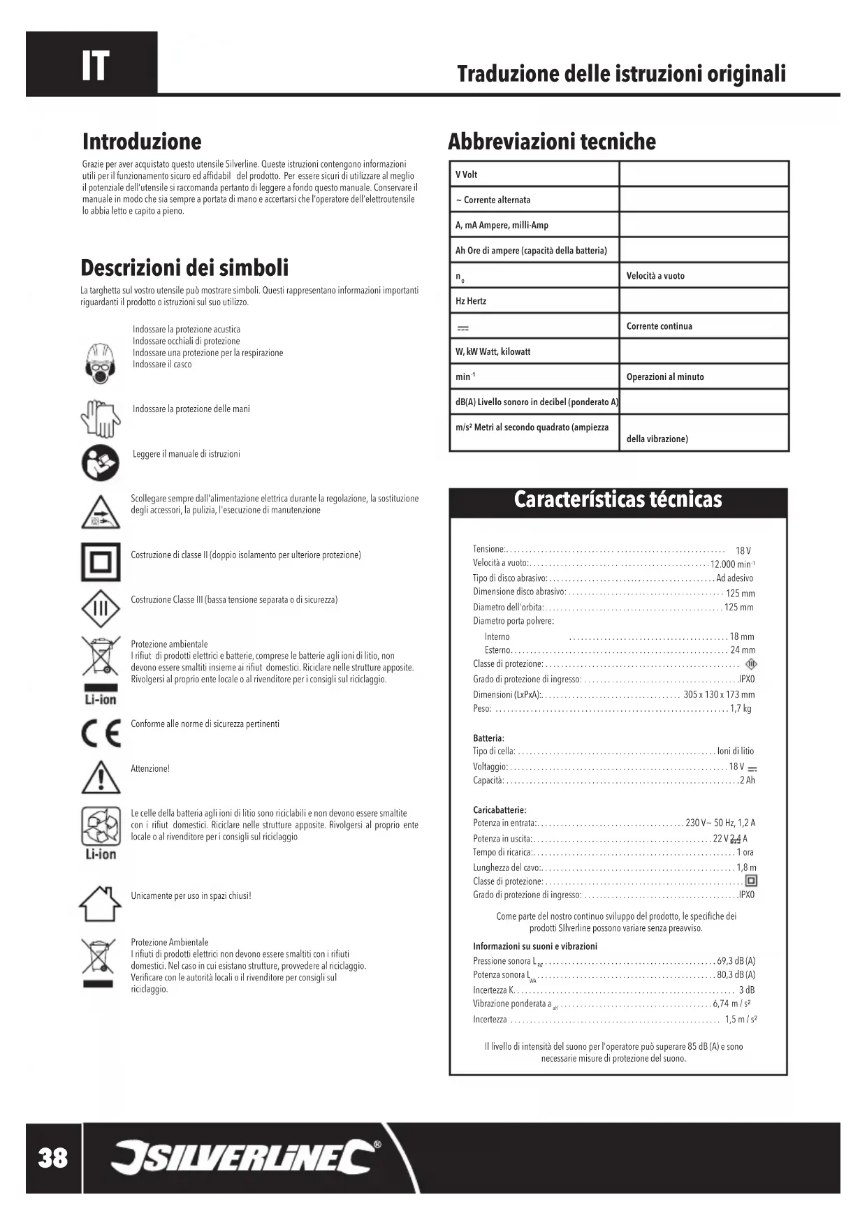 Traduzione delle istruzioni originali Descrizioni dei simboli La targhetta sul vostro utensile può mostrare simboli. Questi rappresentano informazioni importanti riguardanti il prodotto o istruzioni sul suo utilizzo. Indossare la protezione acustica Indossare occhiali di protezione Indossare una protezione per la respirazione Indossare il casco Indossare la protezione delle mani Leggere il manuale di istruzioni Scollegare sempre dall'alimentazione elettrica durante la regolazione, la sostituzione degli accessori, la pulizia, l'esecuzione di manutenzione Costruzione di classe II (doppio isolamento per ulteriore protezione) Costruzione Classe III (bassa tensione separata o di sicurezza) Protezione ambientale I rifiut di prodotti elettrici e batterie,comprese le batterie agli ioni di litio, non devono essere smaltiti insieme ai rifiut domestici. Riciclare nelle strutture apposite. Rivolgersi al proprio ente locale o al rivenditore per i consigli sul riciclaggio. Conforme alle norme di sicurezza pertinenti Attenzione! Le celle della batteria agli ioni di litio sono riciclabili e non devono essere smaltite con i rifiut domestici. Riciclare nelle strutture apposite. Rivolgersi al proprio ente locale o al rivenditore per i consigli sul riciclaggio Unicamente per uso in spazi chiusi! Protezione Ambientale I rifiuti di prodotti elettrici non devono essere smaltiti con i rifiuti domestici. Nel caso in cui esistano strutture, provvedere al riciclaggio. Verificare con le autorità locali o il rivenditore per consigli sul riciclaggio. Introduzione Grazie per aver acquistato questo utensile Silverline. Queste istruzioni contengono informazioni utili per il funzionamento sicuro ed affidabil del prodotto. Per essere sicuri di utilizzare al meglio il potenziale dell’utensile si raccomanda pertanto di leggere a fondo questo manuale. Conservare il manuale in modo che sia sempre a portata di mano e accertarsi che l’operatore dell’elettroutensile lo abbia letto e capito a pieno. 18 V
