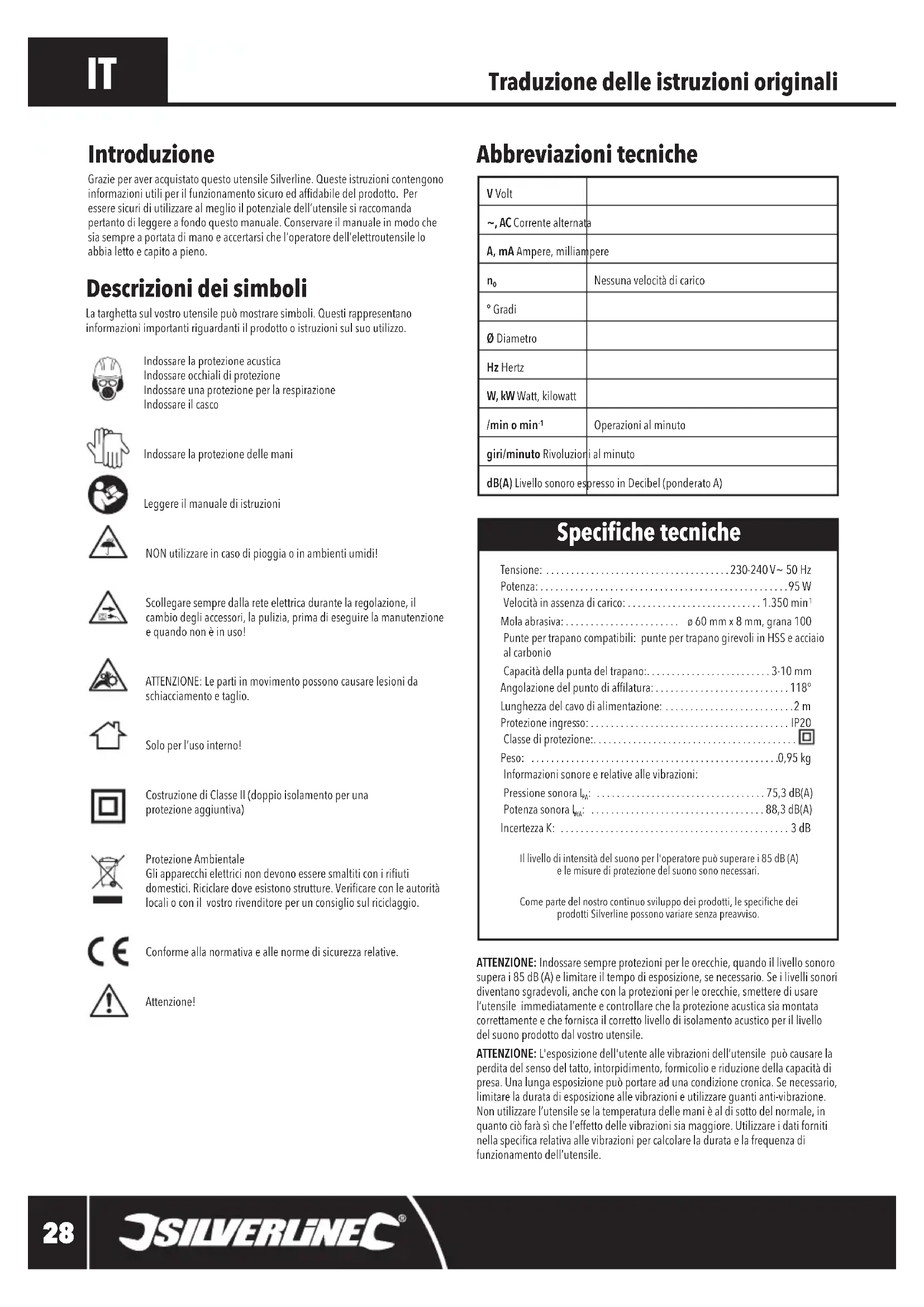 : ...................................88,3dB(A) IncertezzaK: ..............................................3 dB Illivellodiintensitàdelsuonoperl'operatorepuòsuperarei85dB(A) elemisurediprotezionedelsuonosononecessari.Comepartedelnostrocontinuosviluppodeiprodotti,lespecichedei prodottiSilverlinepossonovariaresenzapreavviso. Introduzione GrazieperaveracquistatoquestoutensileSilverline.Questeistruzionicontengono informazioniutiliperilfunzionamentosicuroedafdabiledelprodotto.Per esseresicuridiutilizzarealmeglioilpotenzialedell’utensilesiraccomanda pertantodileggereafondoquestomanuale.Conservareilmanualeinmodoche siasempreaportatadimanoeaccertarsichel’operatoredell’elettroutensilelo abbialettoecapitoapieno. Speciche tecniche V Volt ~, AC Correntealternata A, mA Ampere,milliampere
