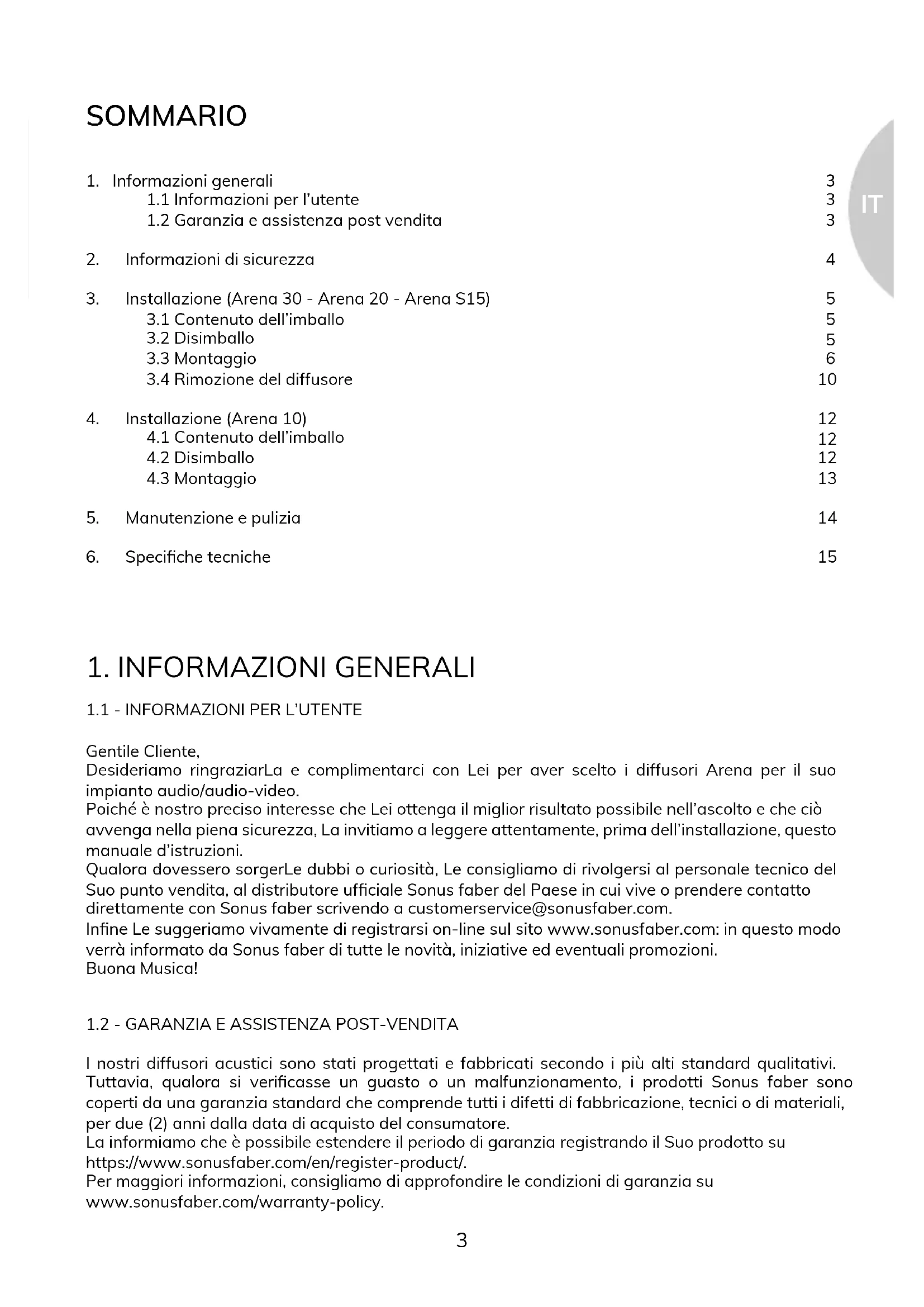 Gentile Cliente, Desideriamo ringraziarLa e complimentarci con Lei per aver scelto i diffusori Arena per il suo impianto audio/audio-video. Poiché è nostro preciso interesse che Lei ottenga il miglior risultato possibile nell’ascolto e che ciò avvenga nella piena sicurezza, La invitiamo a leggere attentamente, prima dell’installazione, questo manuale d’istruzioni. Qualora dovessero sorgerLe dubbi o curiosità, Le consigliamo di rivolgersi al personale tecnico del Suo punto vendita, al distributore ufciale Sonus faber del Paese in cui vive o prendere contatto direttamente con Sonus faber scrivendo a customerservice@sonusfaber.com. Inne Le suggeriamo vivamente di registrarsi on-line sul sito www.sonusfaber.com: in questo modo verrà informato da Sonus faber di tutte le novità, iniziative ed eventuali promozioni. Buona Musica!