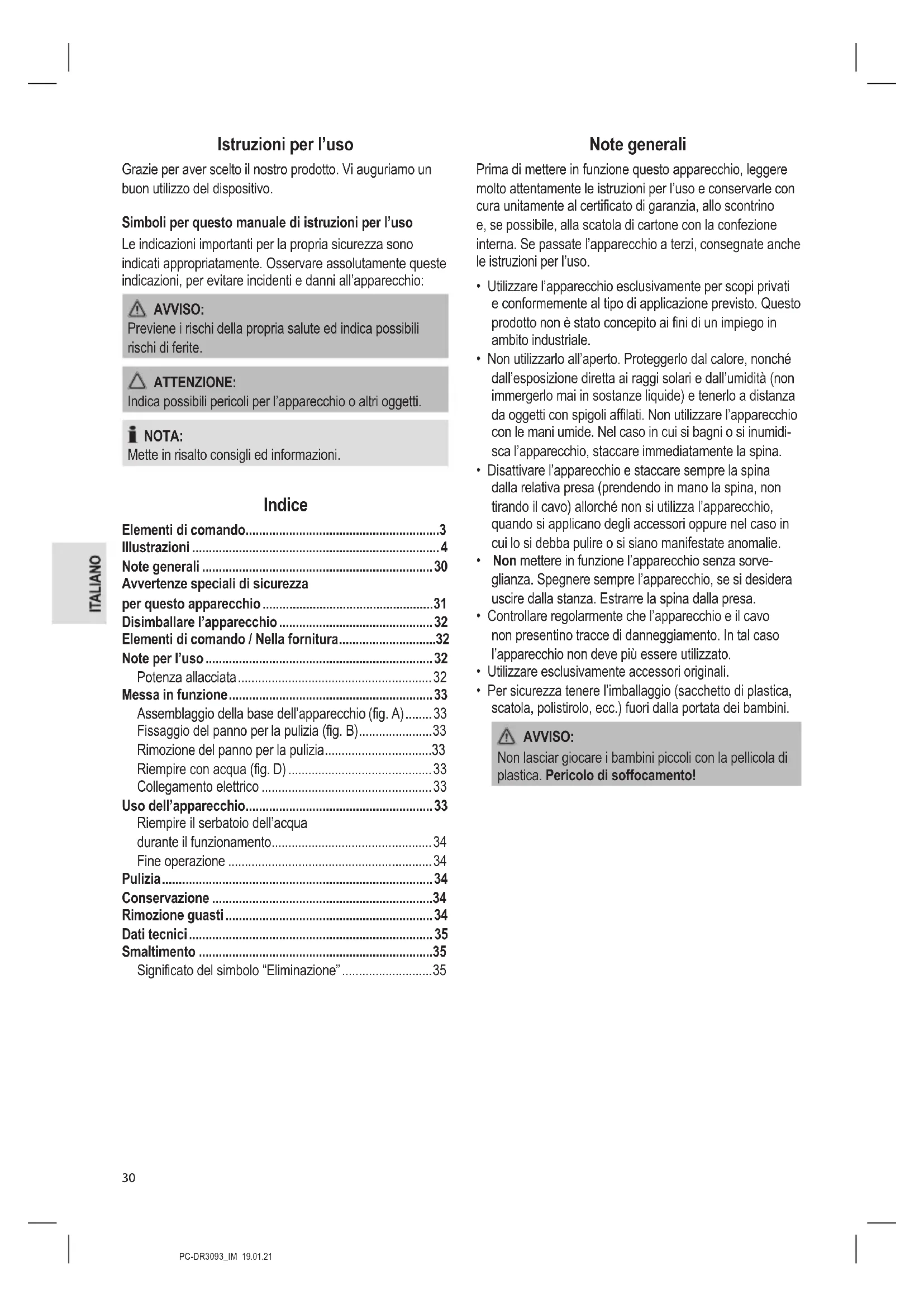 Dati tecnici Modello: ..............................................................PC-DR 3093 Alimentazione rete: .................................. 220 - 240 V~, 50 Hz Consumo di energia: ................................................... 1500 W Classe di protezione: ............................................................. Max. capacità del vapore: ........................................ 45 g / min Capacità del serbatoio: ................................................ 450 ml Peso netto: .............................................................ca. 2,65 kg Si riserva il diritto di apportare modiche tecniche e di design nel corso dello sviluppo del prodotto. Questo dispositivo risponde a tutte le direttive della CE, come la direttiva sulla compatibilità elettromagnetica e quella sul basso voltaggio ed è prodotto secondo le più recenti norme di sicurezza. Smaltimento Significato del simbolo “Eliminazione” Salvaguardare l’ambiente, gli elettrodomestici non vanno eliminati come riuti domestici. Per l’eliminazione degli elettrodomestici, fare uso dei posti di raccolta previsti per questo tipo e porre quegli elettrodomestici che non sono più in uso. Si contribuisce così ad evitare un effetto potenziale sull’am- biente e sulla salute, dovuto magari ad una eliminazione sbagliata. Questo signica un contributo personale alla riutilizzazione, al riciclaggio e altre forme di utilizzazione di elettrodomestici ed apparecchi elettronici usati. Si possono trovare le corrispondenti informazioni sugli ap- positi luoghi di raccolta, nelle amministrazioni dei comuni.PC-DR3093_IM 19.01.21