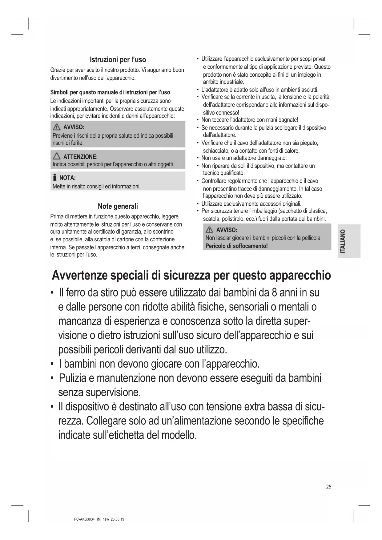 - Tenere sempre l’apparecchio fuori dalla portata dei bambini in un luogo asciutto e ben ventilato.PC-AKS3034_IM_new 26.08.19