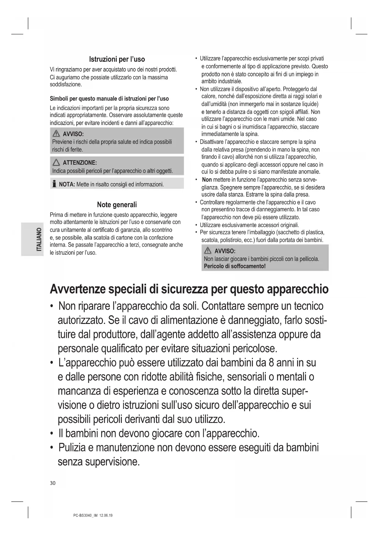 - Pulizia e manutenzione non devono essere eseguiti da bambini senza supervisione.PC-BS3040_IM 12.06.19