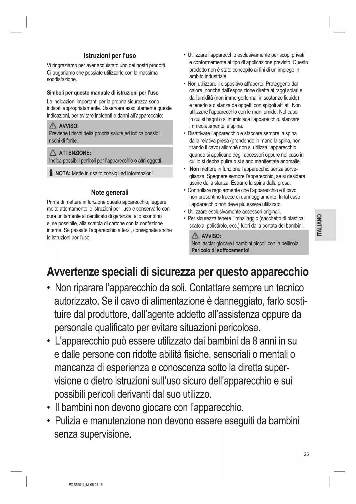 - Pulizia e manutenzione non devono essere eseguiti da bambini senza supervisione.PC-BS3041_IM 06.03.19