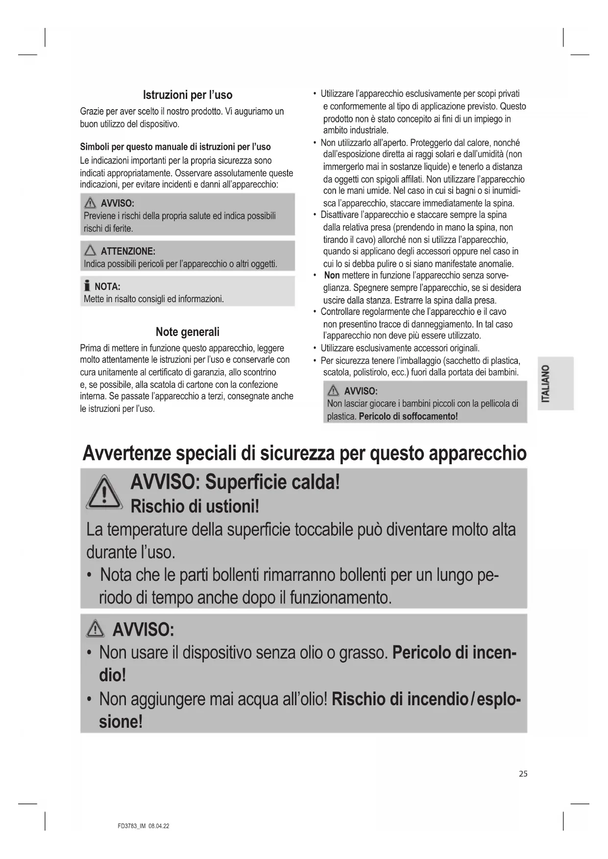 - Olio e grasso possono incendiarsi a temperature molto elevate. Per friggere usate olio apposito di qualità oFD3783_IM 08.04.22