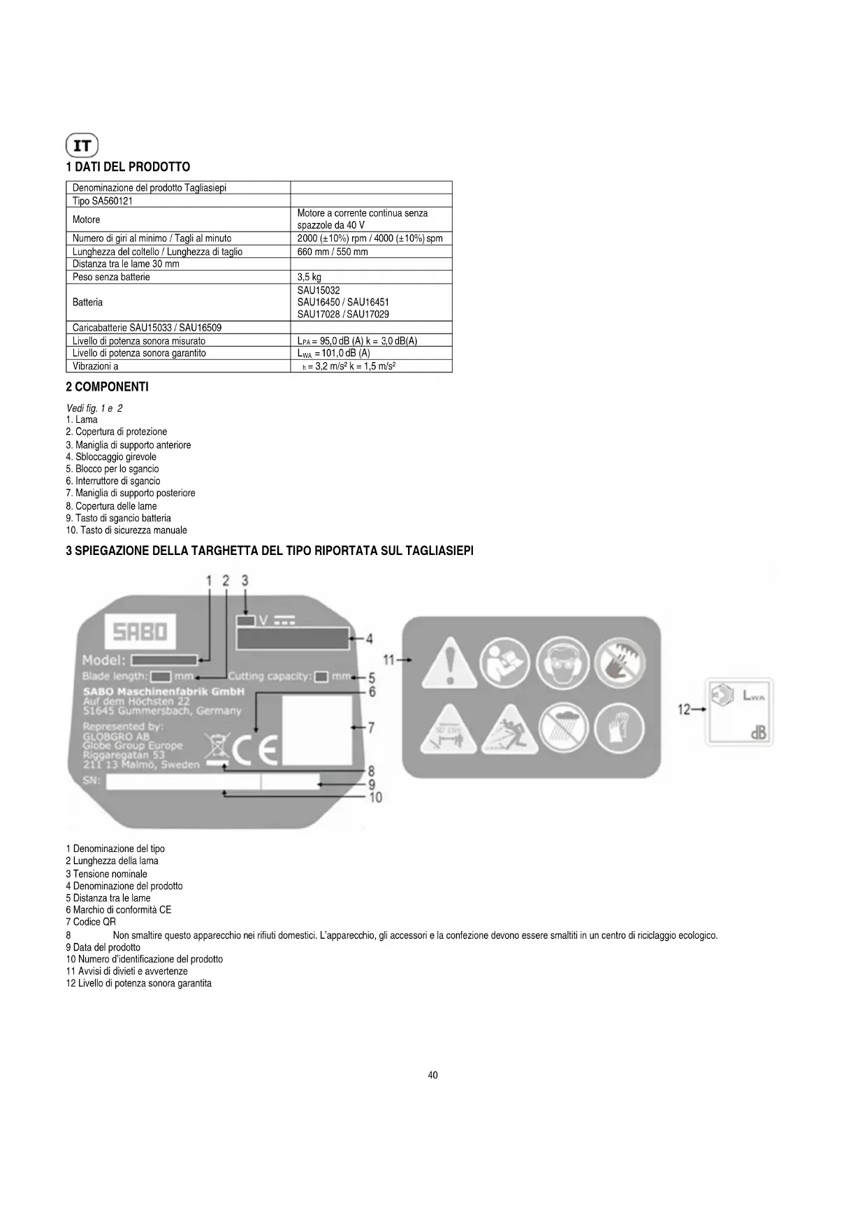 Produttore: SABO Maschinenfabrik GmbH Indirizzo: Auf dem Höchsten 22, 51645 Gummersbach, Deutschland Rappresentato da: GLOBGRO AB, Globe Group Europe Riggaregatan 53, 211 13 Malmö, Schweden Nome e indirizzo della persona autorizzata alla creazione di atti tecnici: Nome: Peter Söderström Indirizzo: Riggaregatan 53, 211 13 Malmö, Schweden Con la presente si dichiara che il prodotto Categoria: tagliasiepi da 40 V Modello: SA560121 Numero di serie: vedi targhetta del tipo prodotto Anno di costruzione: vedi targhetta del tipo prodotto