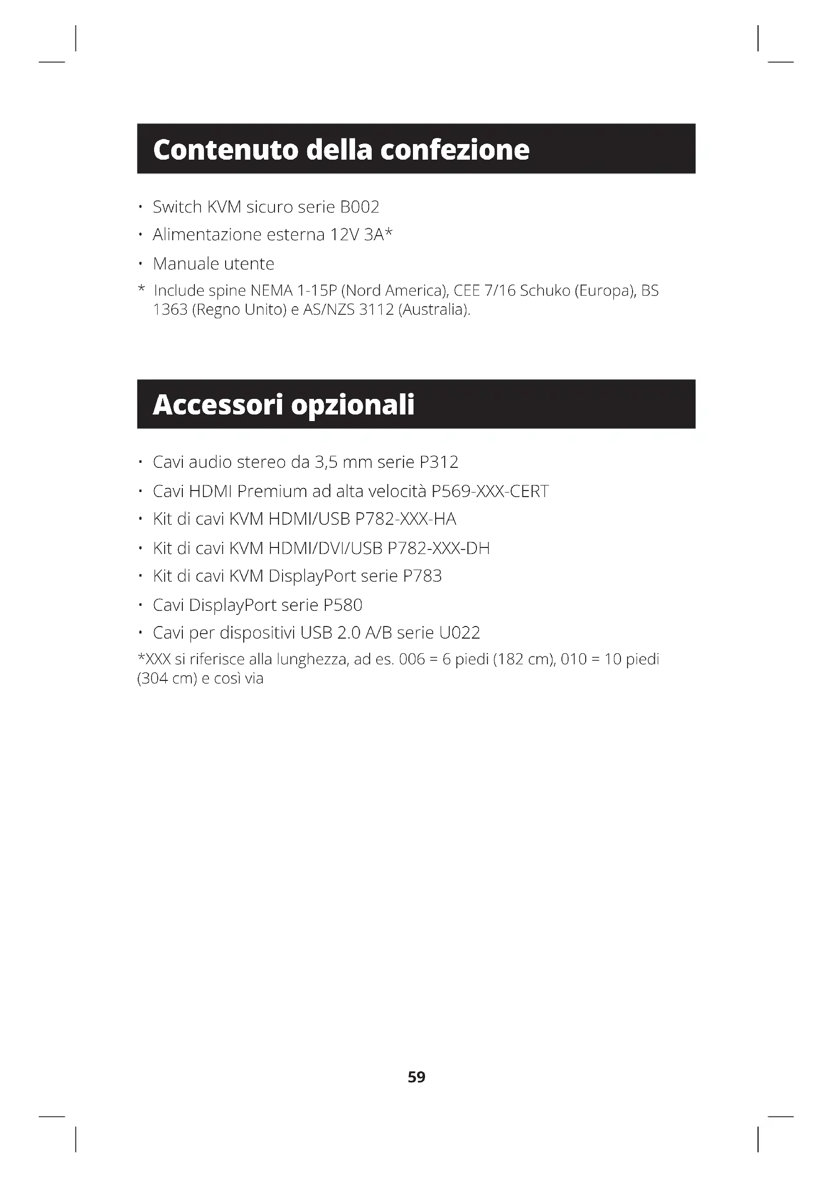 - Cavi per dispositivi USB 2.0 A/B serie U022 *XXXsiriferisceallalunghezza,ades.006=6piedi(182cm),010=10piedi (304 cm) e così via Contenuto della confezione Accessori opzionali60