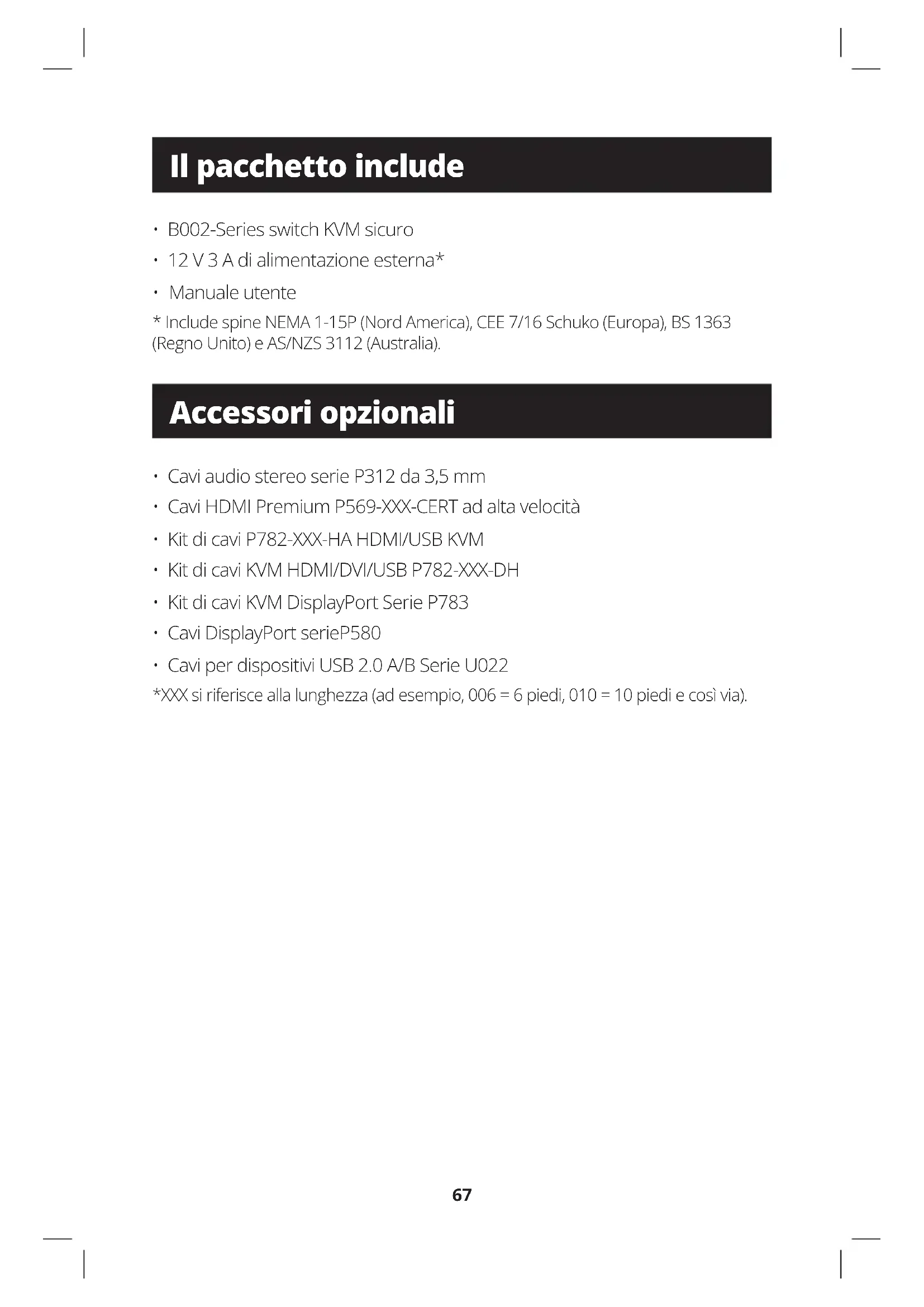 - Cavi per dispositivi USB 2.0 A/B Serie U022 *XXX si riferisce alla lunghezza (ad esempio, 006 = 6 piedi, 010 = 10 piedi e così via). Il pacchetto include Accessori opzionali68
