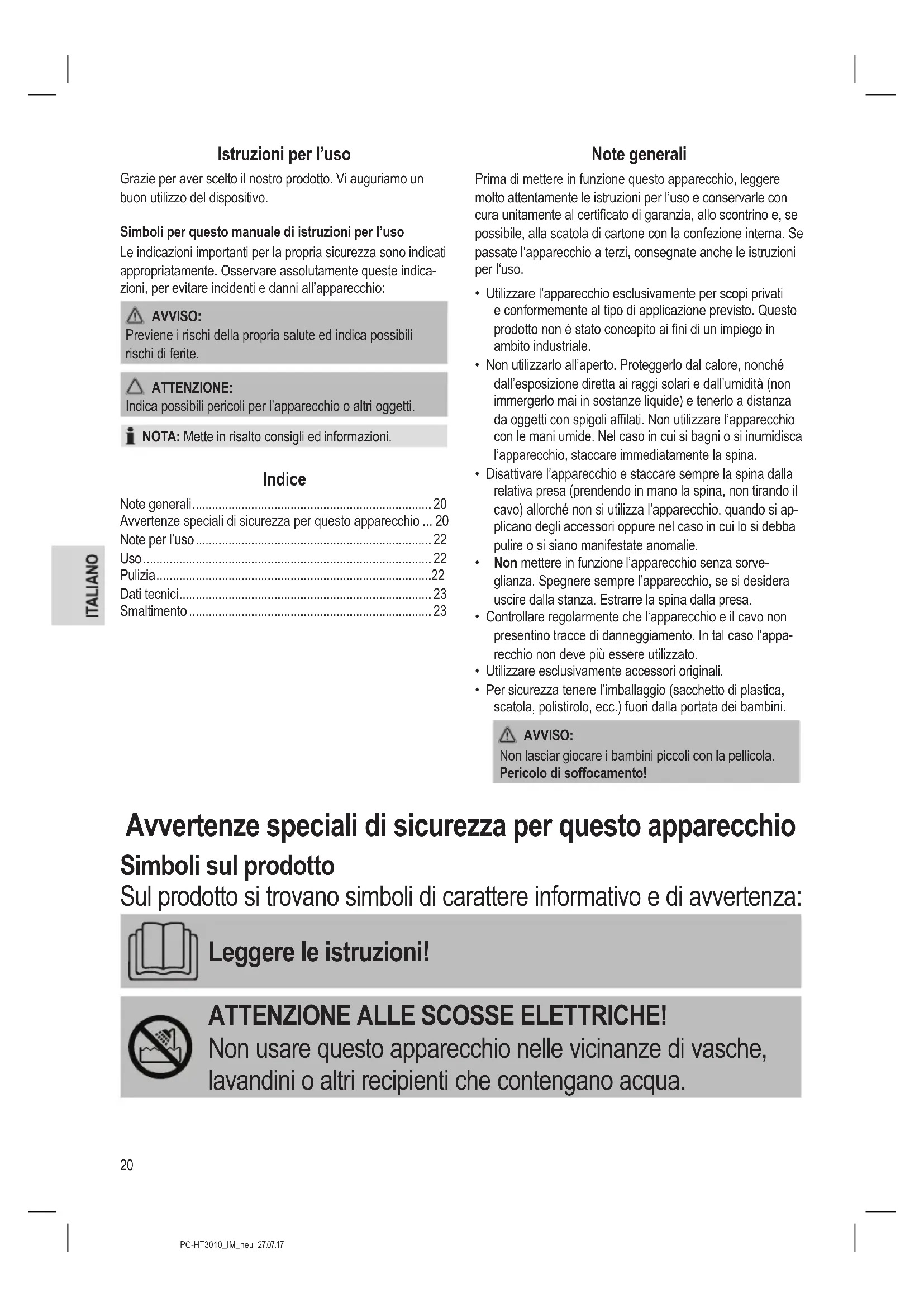 - Per sicurezza tenere l’imballaggio (sacchetto di plastica, scatola, polistirolo, ecc.) fuori dalla portata dei bambini. AVVISO: Non lasciar giocare i bambini piccoli con la pellicola. Pericolo di soffocamento! Avvertenze speciali di sicurezza per questo apparecchio Simboli sul prodotto Sul prodotto si trovano simboli di carattere informativo e di avvertenza: Leggere le istruzioni! ATTENZIONE ALLE SCOSSE ELETTRICHE! Non usare questo apparecchio nelle vicinanze di vasche, lavandini o altri recipienti che contengano acqua.21 PC-HT3010_IM_neu 27.07.17 AVVISO: