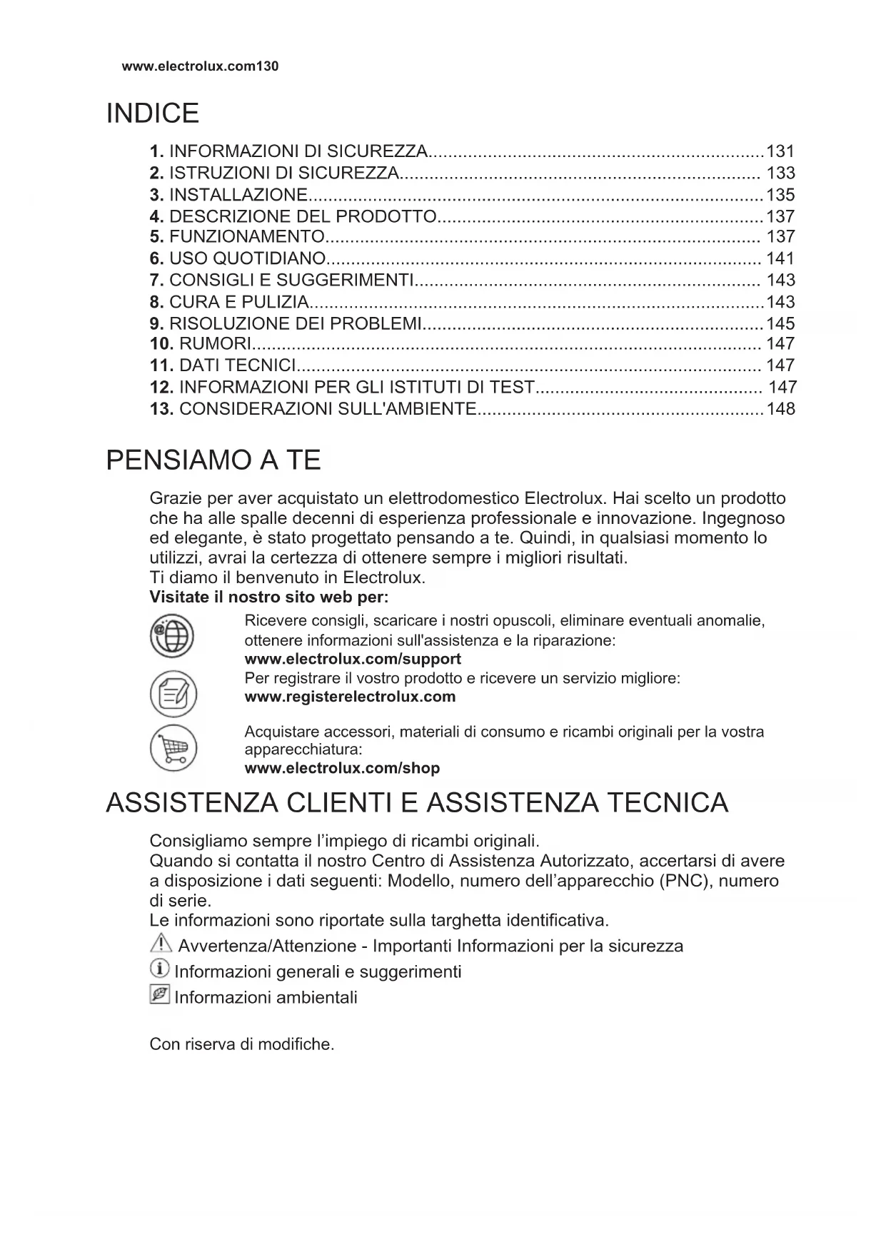 Grazie per aver acquistato un elettrodomestico Electrolux. Hai scelto un prodotto che ha alle spalle decenni di esperienza professionale e innovazione. Ingegnoso ed elegante, è stato progettato pensando a te. Quindi, in qualsiasi momento lo utilizzi, avrai la certezza di ottenere sempre i migliori risultati. Ti diamo il benvenuto in Electrolux. Visitate il nostro sito web per: Ricevere consigli, scaricare i nostri opuscoli, eliminare eventuali anomalie, ottenere informazioni sull'assistenza e la riparazione: www.electrolux.com/support Per registrare il vostro prodotto e ricevere un servizio migliore: www.registerelectrolux.com Acquistare accessori, materiali di consumo e ricambi originali per la vostra apparecchiatura: www.electrolux.com/shop