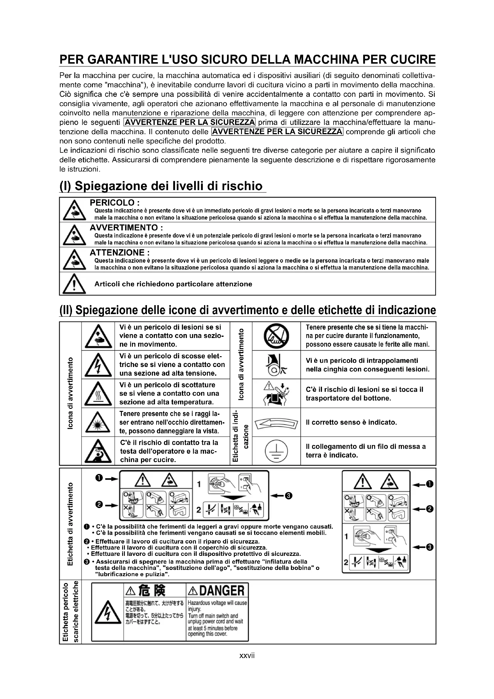 Icona di avvertimento Vi q un pericolo di lesioni se si viene a contatto con una sezio- ne in movimento. Icona di avvertimento Tenere presente che se si tiene la macchi- na per cucire durante il funzionamento, possono essere causate le ferite alle mani. Vi q un pericolo di scosse elet- triche se si viene a contatto con una sezione ad alta tensione. Vi q un pericolo di intrappolamenti nella cinghia con conseguenti lesioni. Vi q un pericolo di scottature se si viene a contatto con una sezione ad alta temperatura. Cq il rischio di lesioni se si tocca il trasportatore del bottone. Tenere presente che se i raggi la- ser entrano nellocchio direttamen- te, possono danneggiare la vista. Etichetta di indi- cazione Il corretto senso q indicato. Cq il rischio di contatto tra la testa delloperatore e la mac- china per cucire. Il collegamento di un ¿lo di messa a terra q indicato. PER GARANTIRE LUSO SICURO DELLA MACCHINA PER CUCIRE (I) Spiegazione dei livelli di rischio (II) Spiegazione delle icone di avvertimento e delle etichette di indicazione PERICOLO : Questa indicazione q presente dove vi q un immediato pericolo di gravi lesioni o morte se la persona incaricata o terzi manovrano male la macchina o non evitano la situazione pericolosa quando si aziona la macchina o si effettua la manutenzione della macchina. AVVERTIMENTO : Questa indicazione q presente dove vi q un potenziale pericolo di gravi lesioni o morte se la persona incaricata o terzi manovrano male la macchina o non evitano la situazione pericolosa quando si aziona la macchina o si effettua la manutenzione della macchina. ATTENZIONE : Questa indicazione q presente dove vi q un pericolo di lesioni leggere o medie se la persona incaricata o terzi manovrano male la macchina o non evitano la situazione pericolosa quando si aziona la macchina o si effettua la manutenzione della macchina. Articoli che richiedono particolare attenzionexxviii