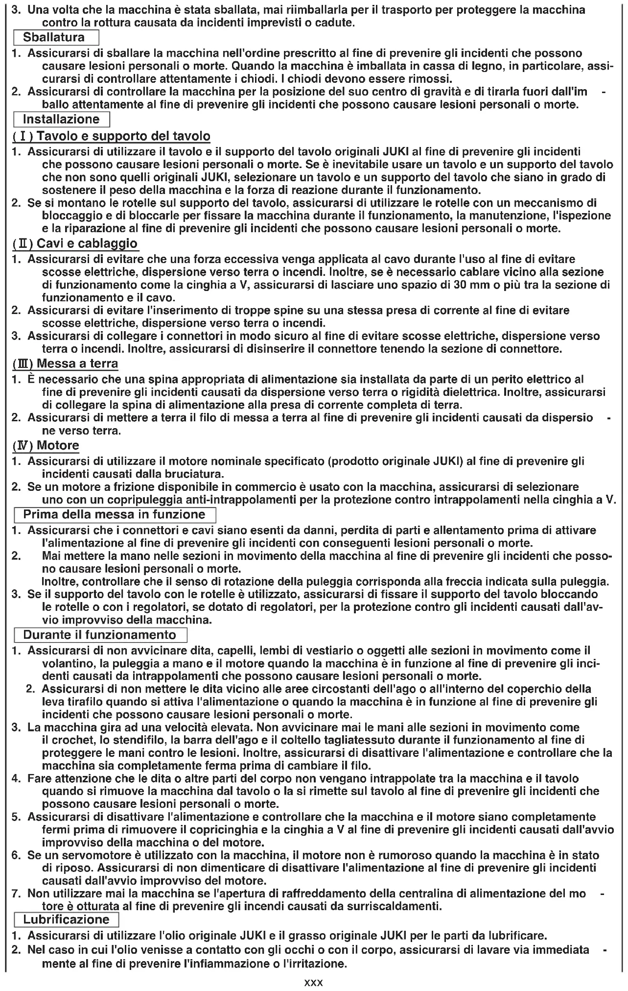 Non utilizzare mai la macchina per altri scopi all'infuori di quelli indicati né in altri modi all'infuori di quello pre- scritto nel manuale d'istruzioni al ne di prevenire gli incidenti che possono causare lesioni personali o morte. La società JUKI non si assume responsabilità alcuna per eventuali danni o lesioni personali o morte cau- sati dall'uso della macchina per altri scopi all'infuori di quelli indicati.