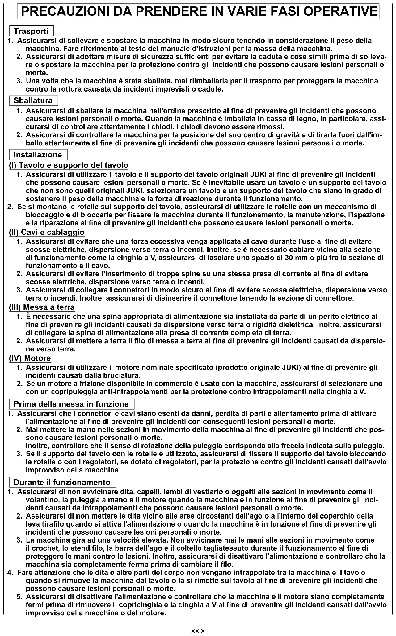 personali o morte. La societj JUKI non si assume responsabilitj alcuna per eventuali danni o lesioni personali o morte causati dalla modi¿ca o alterazione della macchina stessa. Istruzione e addestramento
