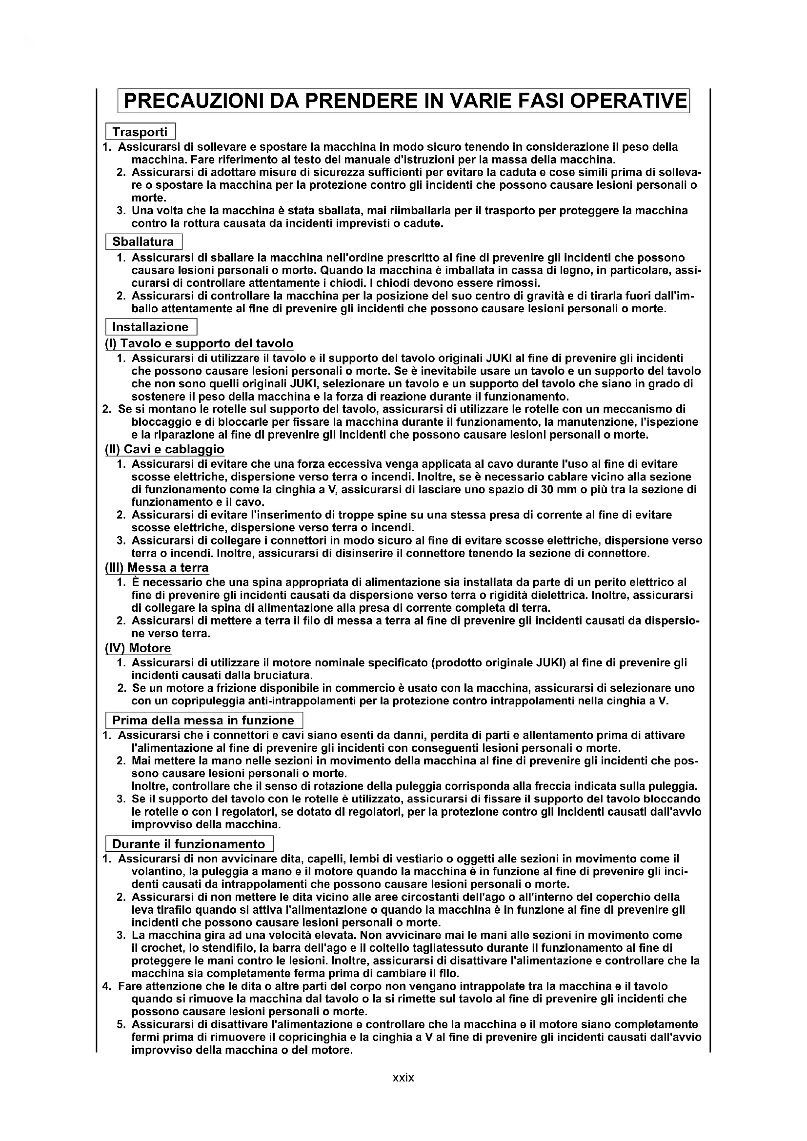 quello prescritto nel manuale distruzioni al ¿ne di prevenire gli incidenti che possono causare lesioni personali o morte. La societj JUKI non si assume responsabilitj alcuna per eventuali danni o lesioni personali o morte causati dalluso della macchina per altri scopi allinfuori di quelli indicati.