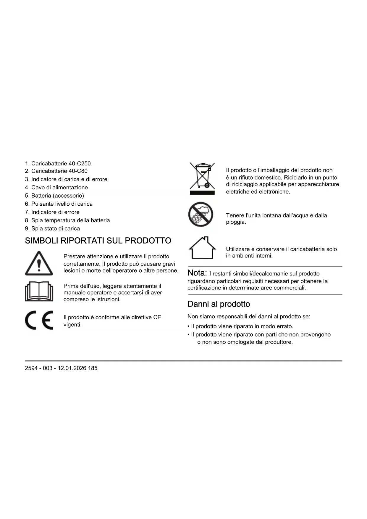 - Il prodotto viene riparato con parti che non provengono o non sono omologate dal produttore. 2594 - 003 - 12.01.2026 185• Il prodotto contiene un accessorio che non proviene o non è omologato dal produttore.