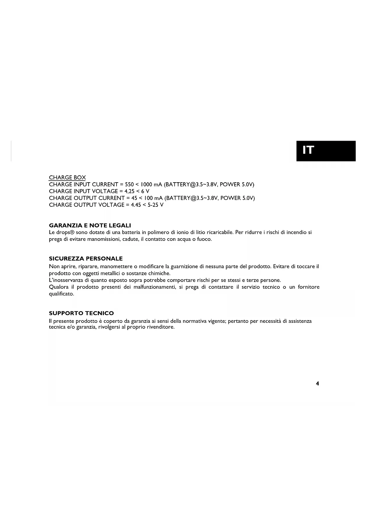 Le drops® sono dotate di una batteria in polimero di ionio di litio ricaricabile. Per ridurre i rischi di incendio si prega di evitare manomissioni, cadute, il contatto con acqua o fuoco.