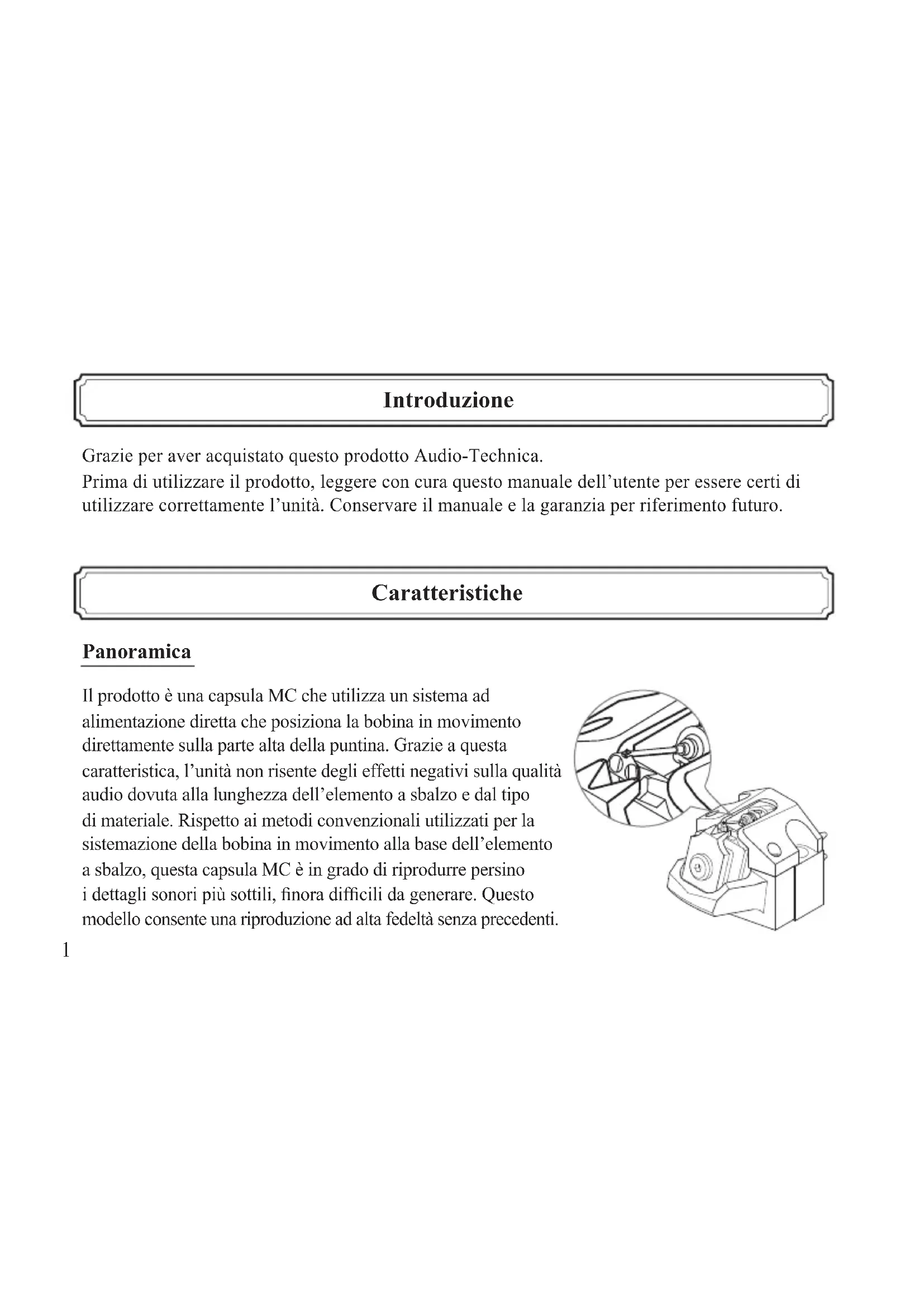 - PCOCC-Anschlusskabelsatz Änderungen der technischen Daten aufgrund von Verbesserungen ohne Ankündigung vorbehalten.1 Introduzione Caratteristiche Grazie per aver acquistato questo prodotto Audio-Technica. Prima di utilizzare il prodotto, leggere con cura questo manuale dell’utente per essere certi di utilizzare correttamente l’unità. Conservare il manuale e la garanzia per riferimento futuro. Panoramica Il prodotto è una capsula MC che utilizza un sistema ad alimentazione diretta che posiziona la bobina in movimento direttamente sulla parte alta della puntina. Grazie a questa caratteristica, l’unità non risente degli effetti negativi sulla qualità audio dovuta alla lunghezza dell’elemento a sbalzo e dal tipo di materiale. Rispetto ai metodi convenzionali utilizzati per la sistemazione della bobina in movimento alla base dell’elemento a sbalzo, questa capsula MC è in grado di riprodurre persino i dettagli sonori più sottili, nora difcili da generare. Questo modello consente una riproduzione ad alta fedeltà senza precedenti.2