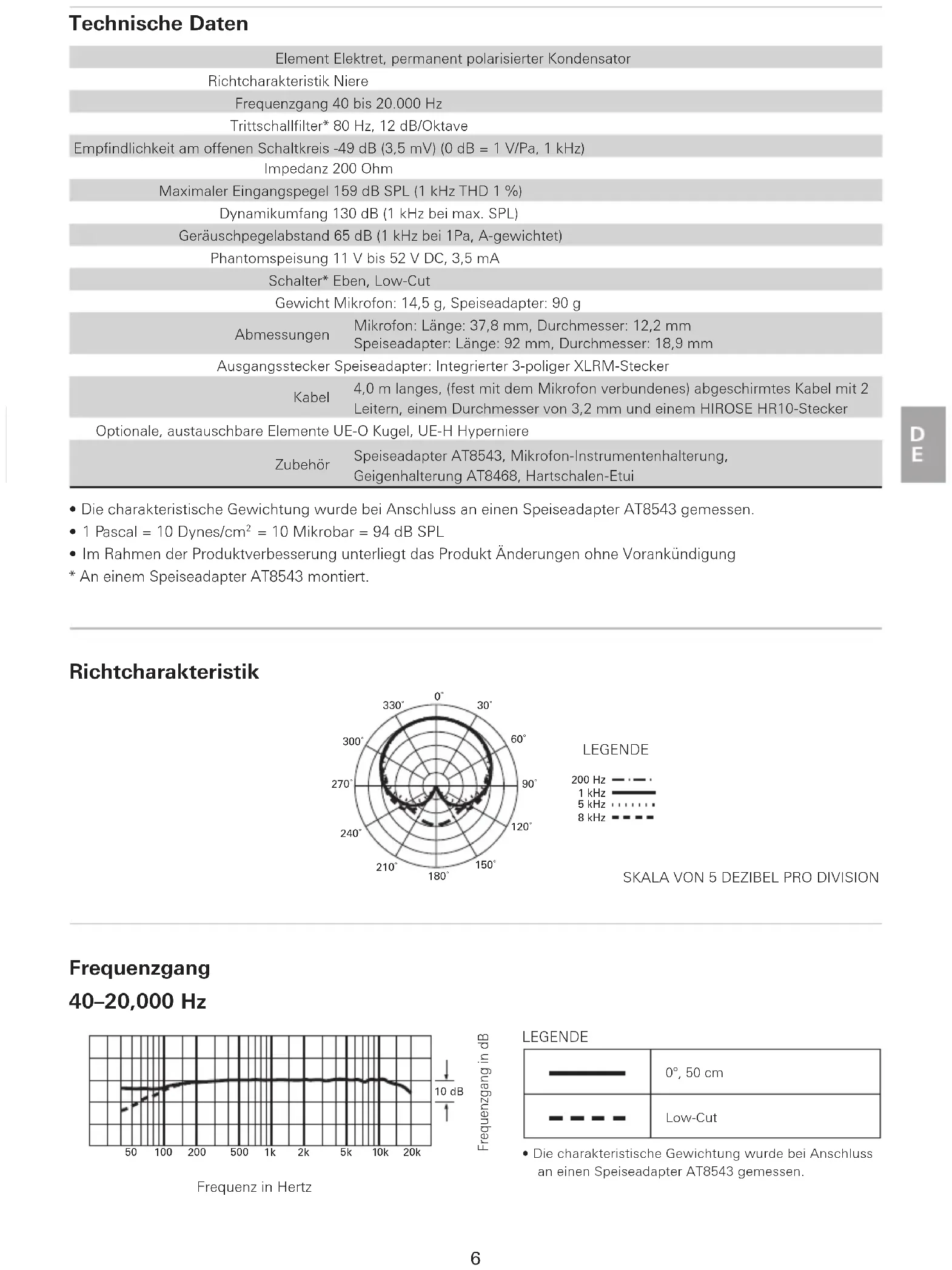 Specifiche tecniche Capsula Condensatore polarizzato permanentemente, a piastra posteriore, a carica fissa Schema polare Cardioide Risposta in frequenza 40 - 20.000 Hz Attenuatore delle frequenze basse* 80 Hz, 12 dB/ottava Sensibilità a circuito aperto -49 dB (3,5mV) (0dB=1V/Pa, 1 kHz) Impedenza 200 ohm Max pressione sonora d'ingresso 159 dB SPL (1 kHz THD 1%) Gamma dinamica 130 dB (1 kHz a SPL max) Rapporto segnale/rumore 65 dB (1 kHz a 1Pa, pesata in A) Requisiti alimentazione Phantom 11 V - 52 V cc, 3,5 mA Commutatore* Lineare, attenuatore Peso Microfono: 14,5 g, Modulo di alimentazione: 90 g Dimensioni Microfono: 37,8 mm lunghezza, 12,2 mm diametro@@Modulo di alimentazione: 92 mm lunghezza, 18,9 mm diametro Connettore di uscita Modulo di alimentazione: Tipo XLRM 3 poli integrato Cavo/i Cavo 4,0 m lunghezza (stabilmente attaccato al microfono), 3,2 mm diametro, a 2 conduttori schermato con connettore tipo HIROSE HR10 Capsule intercambiabili opzionali UE-O omnidirezionale, UE-H ipercardioide Accessori Modulo di alimentazione AT8543, montaggio del microfono per lo strumento, montaggio per violino AT8468, custodia rigida