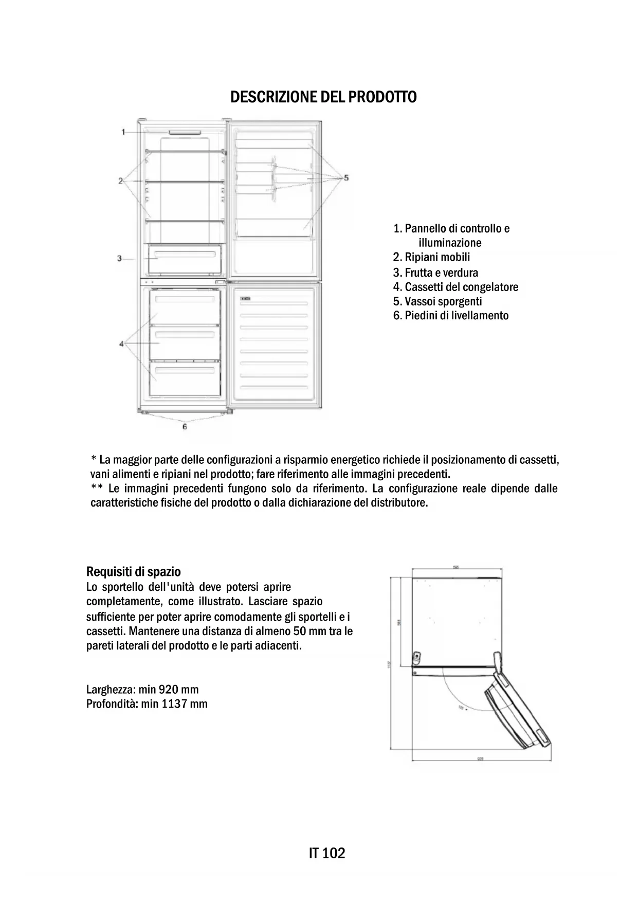- La maggior parte delle configurazioni a risparmio energetico richiede il posizionamento di cassetti, vani alimenti e ripiani nel prodotto; fare riferimento alle immagini precedenti. ** Le immagini precedenti fungono solo da riferimento. La configurazione reale dipende dalle caratteristiche fisiche del prodotto o dalla dichiarazione del distributore. Requisiti di spazio Lo sportello dell'unità deve potersi aprire completamente, come illustrato. Lasciare spazio sufficiente per poter aprire comodamente gli sportelli e i cassetti. Mantenere una distanza di almeno 50 mm tra le pareti laterali del prodotto e le parti adiacenti. Larghezza: min 920 mm Profondità: min 1137 mmIT 103 UTILIZZO ➀ Tasto di accensione/spegnimento: per accendere e spegnere l’elettrodomestico. ➁ Tasto “Mode”: per selezionare la temperatura del frigorifero o le funzioni speciali. ➂ Icona Wi-Fi: indica se l’elettrodomestico è collegato all’app. ➃ Icona Super Cool: indica se la funzione è attivata. ➄ Livelli di temperatura: indicano la temperatura selezionata. Utilizzo