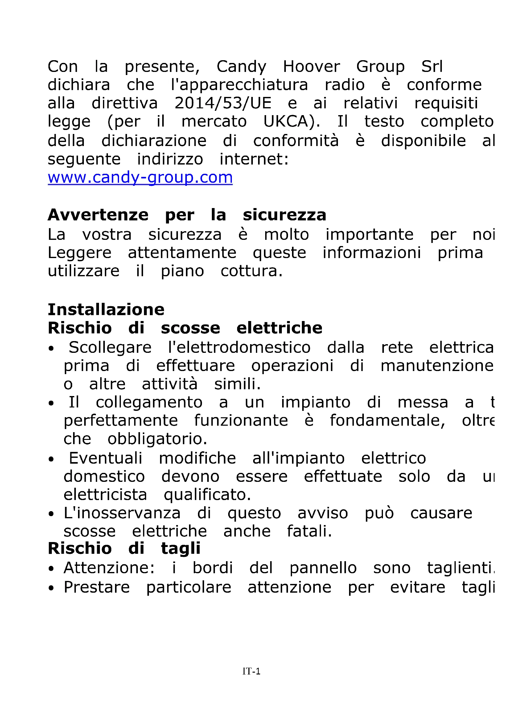 - Use pans whose diameter is as large as the graphic of the zone selected.IT-1 Con la presente, Candy Hoover Group Srl dichiara che l'apparecchiatura radio è conforme alla direttiva 2014/53/UE e ai relativi requisiti di legge (per il mercato UKCA). Il testo completo della dichiarazione di conformità è disponibile al seguente indirizzo internet: www.candy-group.com Avvertenze per la sicurezza La vostra sicurezza è molto importante per noi. Leggere attentamente queste informazioni prima di utilizzare il piano cottura. Installazione Rischio di scosse elettriche