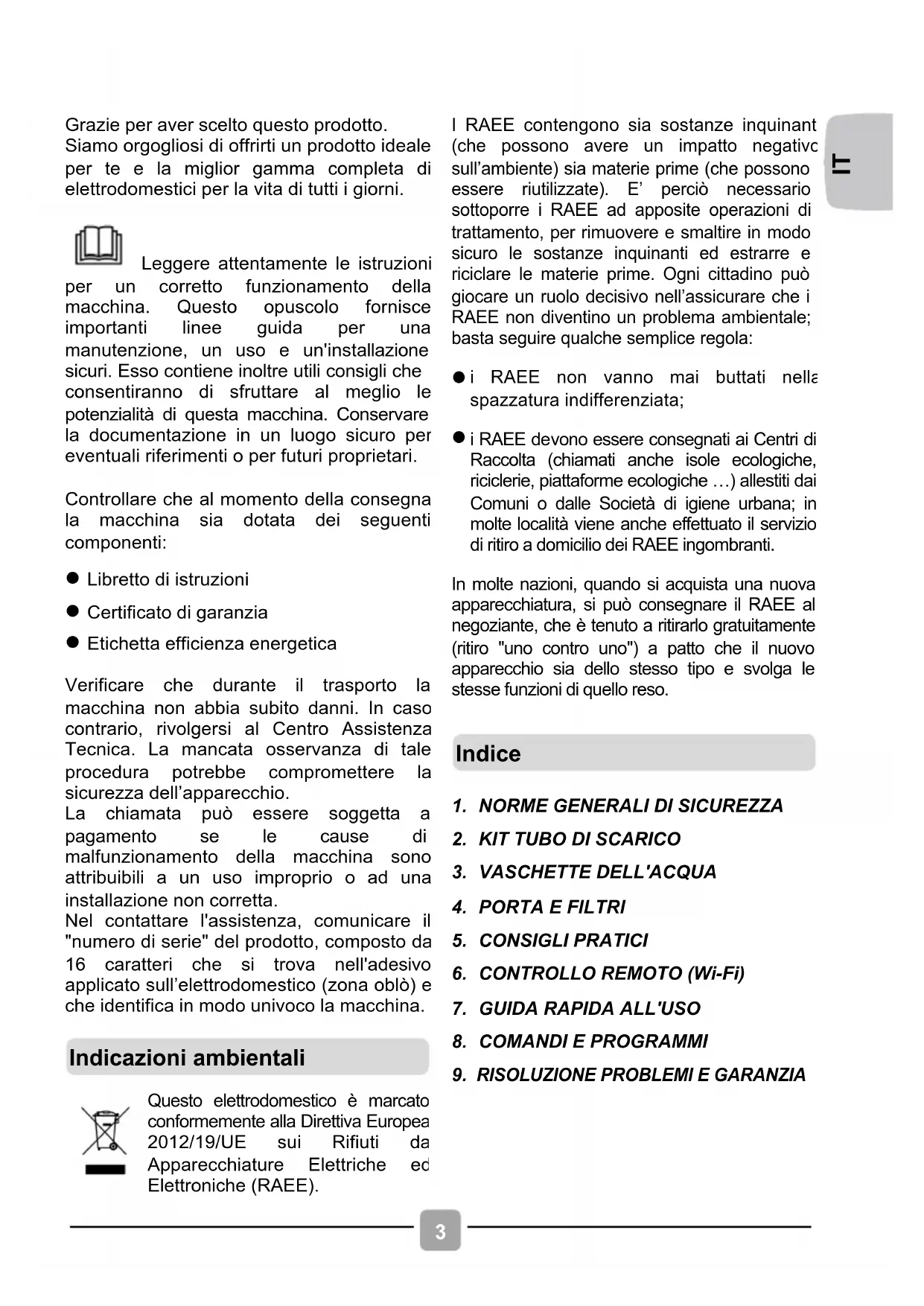 Leggere attentamente le istruzioni per un corretto funzionamento della macchina. Questo opuscolo fornisce importanti linee guida per una manutenzione, un uso e un'installazione sicuri. Esso contiene inoltre utili consigli che consentiranno di sfruttare al meglio le potenzialità di questa macchina. Conservare la documentazione in un luogo sicuro per eventuali riferimenti o per futuri proprietari.