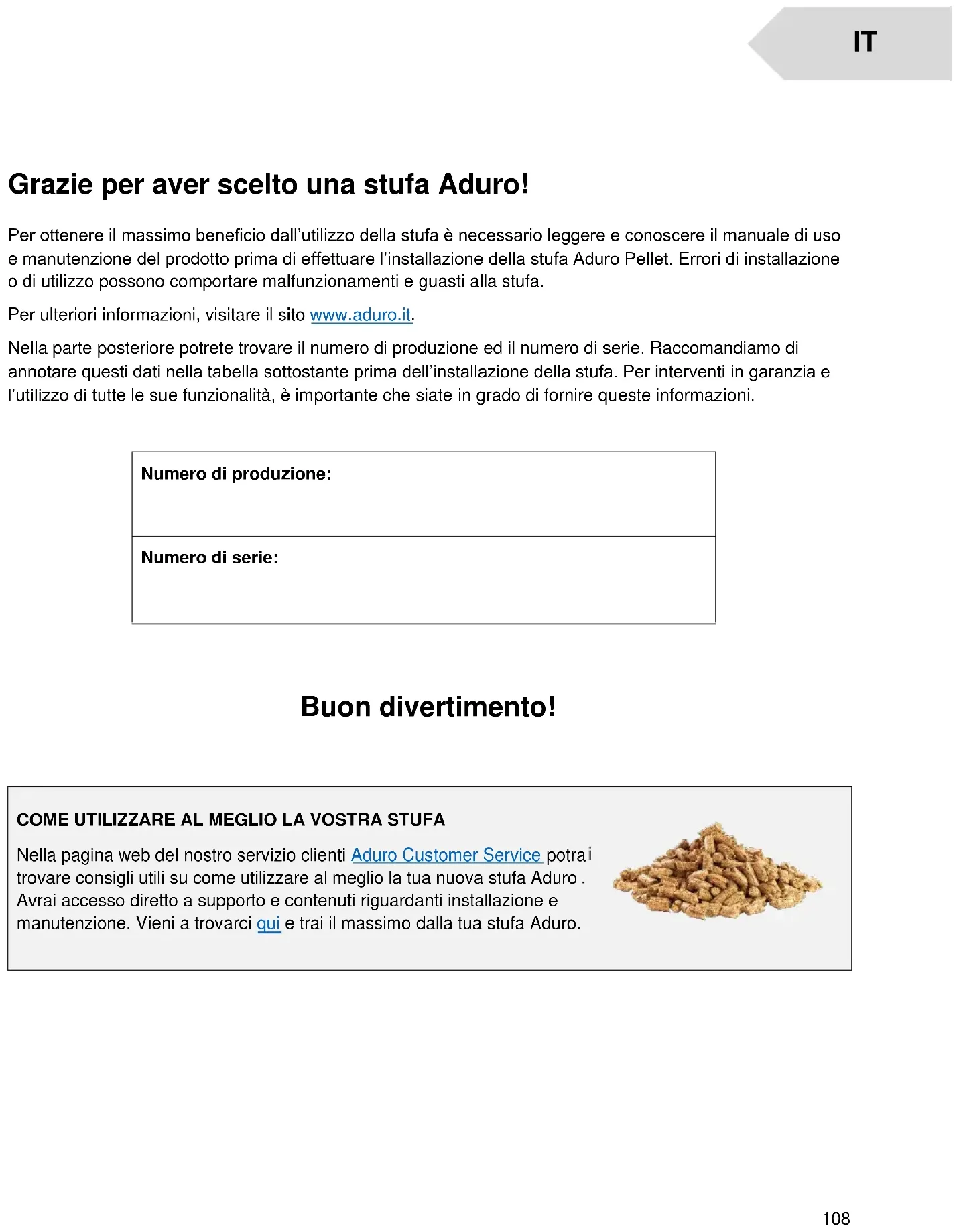 Grazie per aver scelto una stufa Aduro! Per ottenere il massimo beneficio dall’utilizzo della stufa è necessario leggere e conoscere il manuale di uso e manutenzione del prodotto prima di effettuare l’installazione della stufa Aduro Pellet. Errori di installazione o di utilizzo possono comportare malfunzionamenti e guasti alla stufa. Per ulteriori informazioni, visitare il sito www.aduro.it. Nella parte posteriore potrete trovare il numero di produzione ed il numero di serie. Raccomandiamo di annotare questi dati nella tabella sottostante prima dell’installazione della stufa. Per interventi in garanzia e l’utilizzo di tutte le sue funzionalità, è importante che siate in grado di fornire queste informazioni. Numero di produzione: Numero di serie: