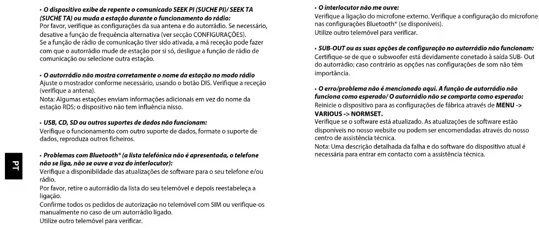 Errore/problema diverso da quelli sopraelencati. La funzione dell'autoradio non funziona come previsto/ L'autoradio non si comporta come previsto: Resettare l’autoradio alle impostazioni di fabbrica tramite MENU -> VARIOUS -> NORMSET. Controllare se il software sia aggiornato. Gli attuali aggiornamenti del software sono disponibili sul nostro sito web o possono essere ordinati attraverso la nostra assistenza tecnica. Attenzione: Una descrizione dettagliata del guasto e il software attuale del dispositivo sono necessari per contattare l’assistenza tecnica.PL
