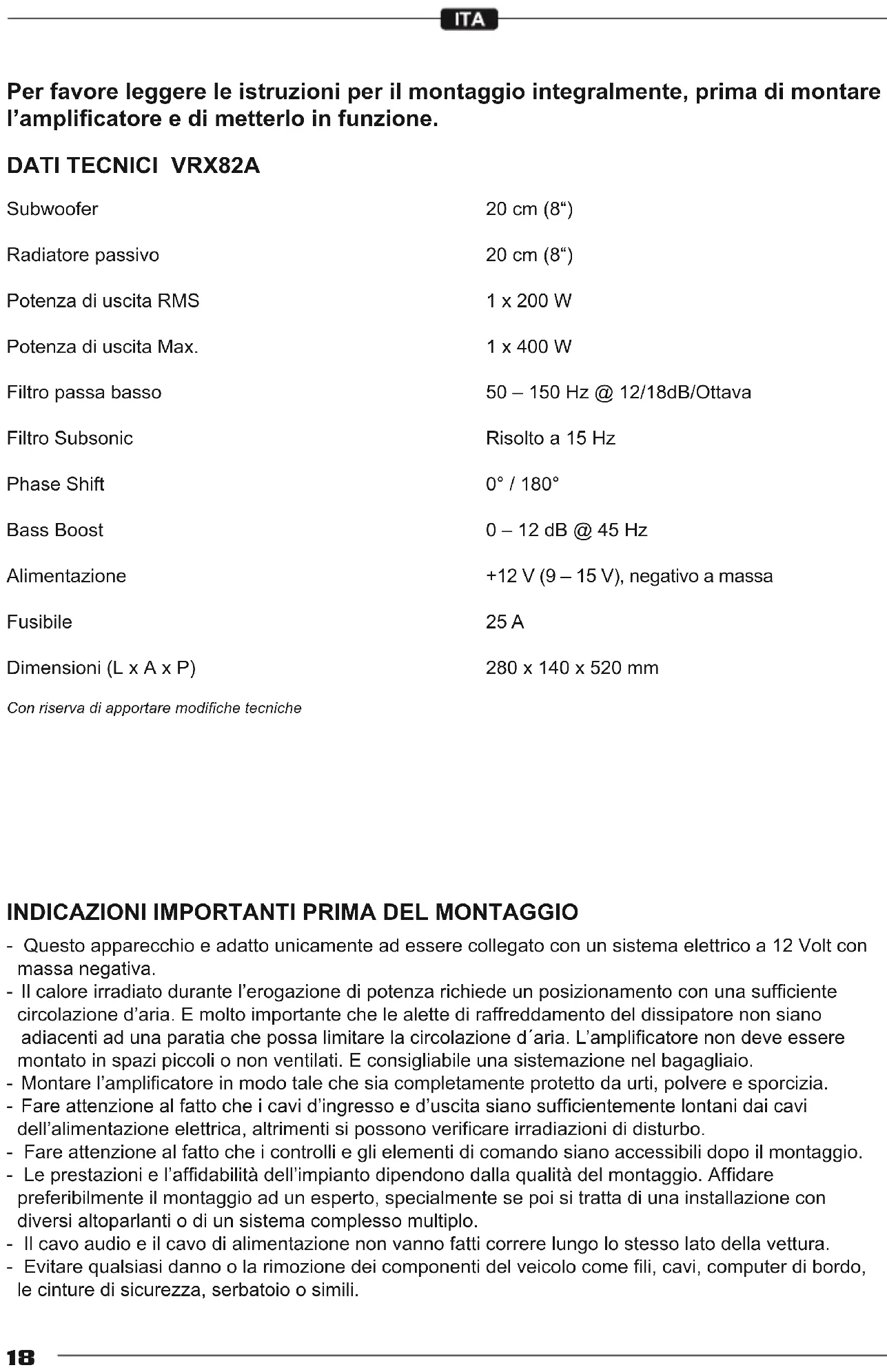 - Questo apparecchio e adatto unicamente ad essere collegato con un sistema elettrico a 12 Volt con massa negativa. - Il calore irradiato durante l’erogazione di potenza richiede un posizionamento con una sufciente circolazione d’aria. E molto importante che le alette di raffreddamento del dissipatore non siano adiacenti ad una paratia che possa limitare la circolazione d´aria. L’amplicatore non deve essere montato in spazi piccoli o non ventilati. E consigliabile una sistemazione nel bagagliaio. - Montare l’amplicatore in modo tale che sia completamente protetto da urti, polvere e sporcizia. - Fare attenzione al fatto che i cavi d’ingresso e d’uscita siano sufcientemente lontani dai cavi dell’alimentazione elettrica, altrimenti si possono vericare irradiazioni di disturbo. - Fare attenzione al fatto che i controlli e gli elementi di comando siano accessibili dopo il montaggio. - Le prestazioni e l’afdabilità dell’impianto dipendono dalla qualità del montaggio. Afdare preferibilmente il montaggio ad un esperto, specialmente se poi si tratta di una installazione con diversi altoparlanti o di un sistema complesso multiplo. - Il cavo audio e il cavo di alimentazione non vanno fatti correre lungo lo stesso lato della vettura. - Evitare qualsiasi danno o la rimozione dei componenti del veicolo come li, cavi, computer di bordo, le cinture di sicurezza, serbatoio o simili.19