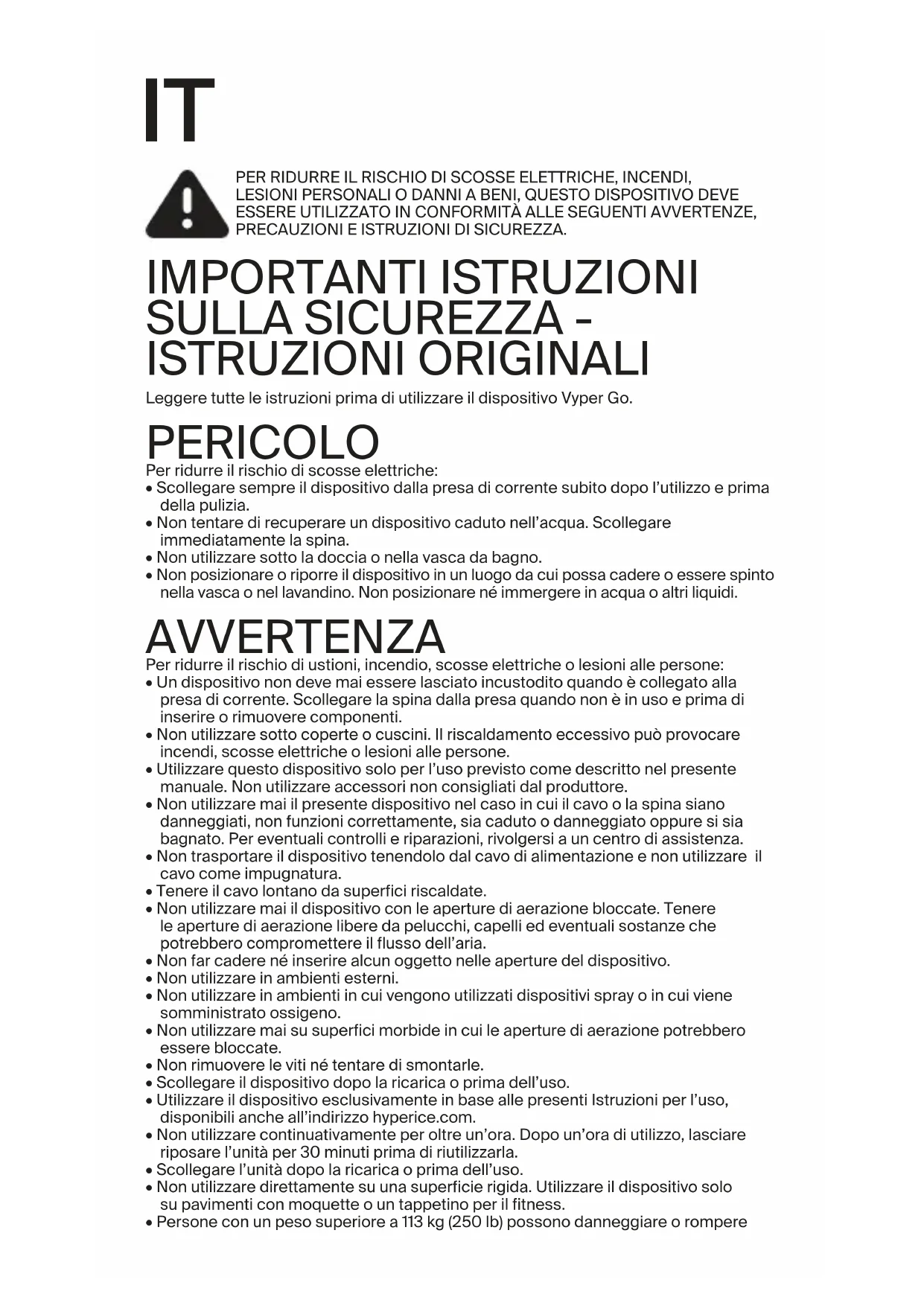 5IT PER RIDURRE IL RISCHIO DI SCOSSE ELETTRICHE, INCENDI, LESIONI PERSONALI O DANNI A BENI, QUESTO DISPOSITIVO DEVE ESSERE UTILIZZATO IN CONFORMITÀ ALLE SEGUENTI AVVERTENZE, PRECAUZIONI EISTRUZIONI DI SICUREZZA. IMPORTANTI ISTRUZIONI SULLA SICUREZZA - ISTRUZIONI ORIGINALI Leggere tutte le istruzioni prima di utilizzare il dispositivo Vyper Go. PERICOLO Per ridurre il rischio di scosse elettriche: