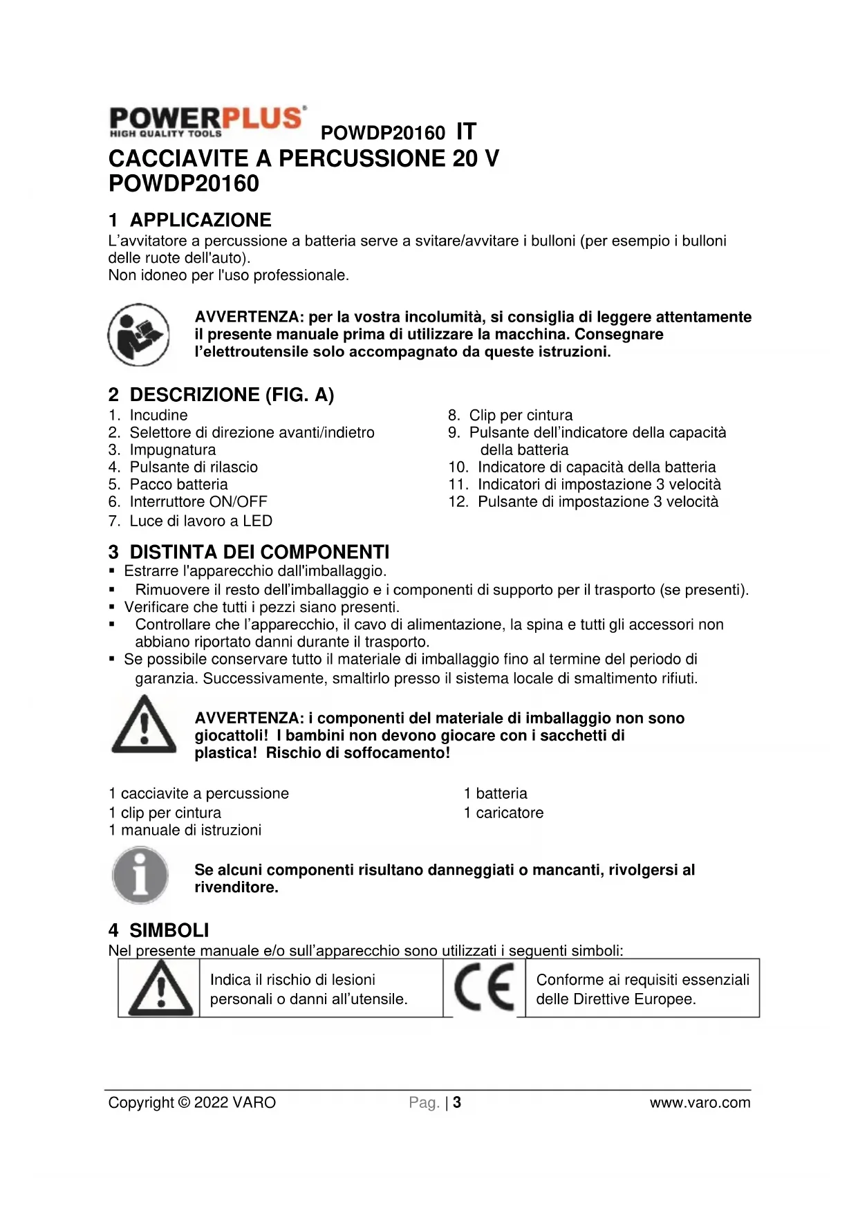 Conforme ai requisiti essenziali delle Direttive Europee.POWDP20160 IT Copyright © 2022 VARO Pag. | 4 www.varo.com