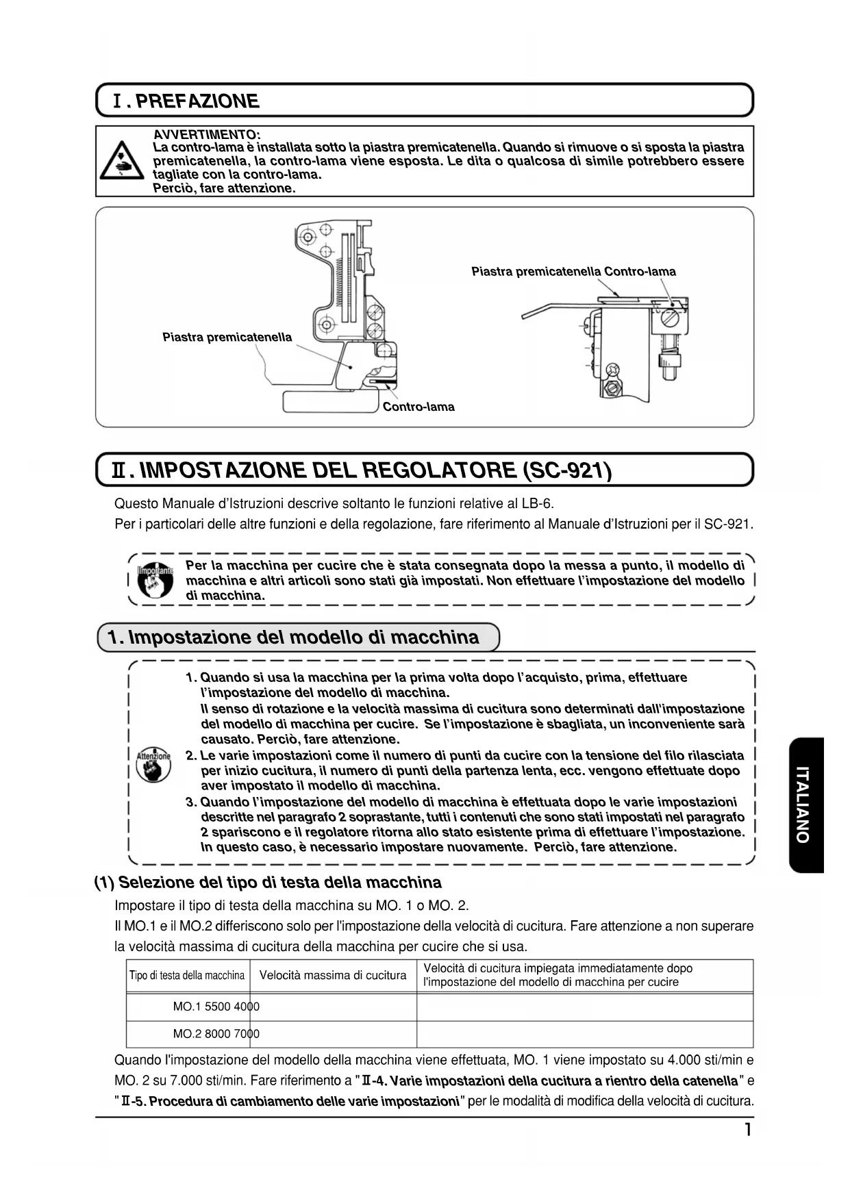 . PREFAZIONE Quando l'impostazione del modello della macchina viene effettuata, MO. 1 viene impostato su 4.000 sti/min eMO. 2 su 7.000 sti/min. Fare riferimento a "@-4. Varie impostazioni della cucitura a rientro della catenella" e"@-5. Procedura di cambiamento delle varie impostazioni" per le modalità di modifica della velocità di cucitura.Piastra premicatenella Contro-lamaPiastra premicatenellaContro-lamaAVVERTIMENTO:La contro-lama è installata sotto la piastra premicatenella. Quando si rimuove o si sposta la piastrapremicatenella, la contro-lama viene esposta. Le dita o qualcosa di simile potrebbero esseretagliate con la contro-lama.Perciò, fare attenzione.1. Quando si usa la macchina per la prima volta dopo l’acquisto, prima, effettuarel’impostazione del modello di macchina.Il senso di rotazione e la velocità massima di cucitura sono determinati dall'impostazionedel modello di macchina per cucire. Se l’impostazione è sbagliata, un inconveniente saràcausato. Perciò, fare attenzione.2. Le varie impostazioni come il numero di punti da cucire con la tensione del filo rilasciataper inizio cucitura, il numero di punti della partenza lenta, ecc. vengono effettuate dopoaver impostato il modello di macchina.3. Quando l’impostazione del modello di macchina è effettuata dopo le varie impostazionidescritte nel paragrafo 2 soprastante, tutti i contenuti che sono stati impostati nel paragrafo2 spariscono e il regolatore ritorna allo stato esistente prima di effettuare l’impostazione.In questo caso, è necessario impostare nuovamente. Perciò, fare attenzione.