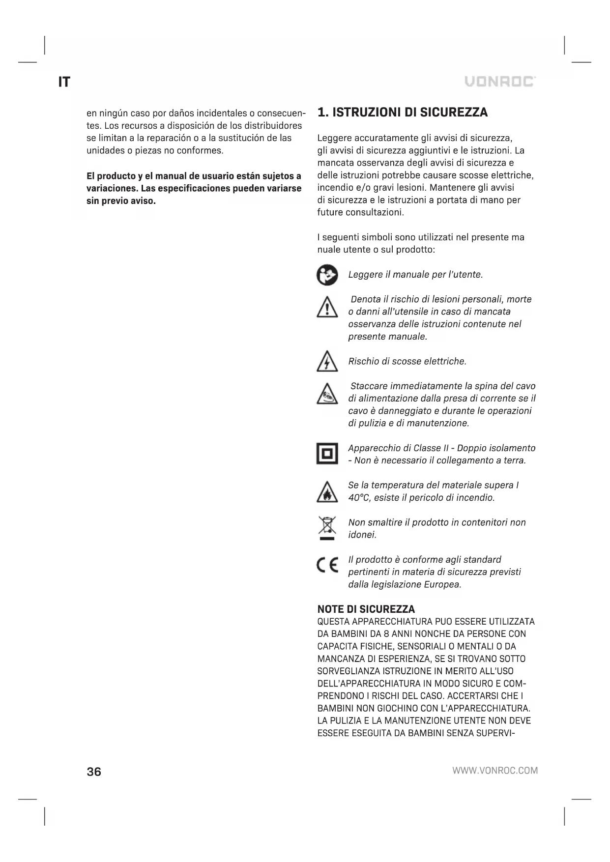 I prodotti VONROC sono sviluppati secondo i più elevati standard di qualità e viene garantita l’assen- za di difetti nei materiali e nella manodopera per il periodo contrattuale a partire dalla data di acquisto originale. Qualora il prodotto dovesse subire un guasto qualsiasi durante questo periodo a causa di difetti nei materiali e/o nella manodopera, si prega di contattare direttamente il VONROC. Le seguenti circostanze sono escluse da questa garanzia: