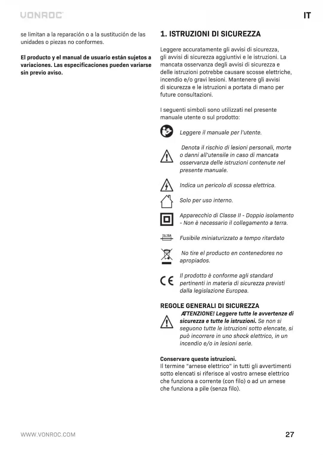 I prodotti VONROC sono sviluppati secondo i più elevati standard di qualità e viene garantita l’assen- za di difetti nei materiali e nella manodopera per il periodo contrattuale a partire dalla data di acquisto originale. Qualora il prodotto dovesse subire un guasto qualsiasi durante questo periodo a causa di difetti nei materiali e/o nella manodopera, si prega di contattare direttamente il VONROC. Le seguenti circostanze sono escluse da questa garanzia: