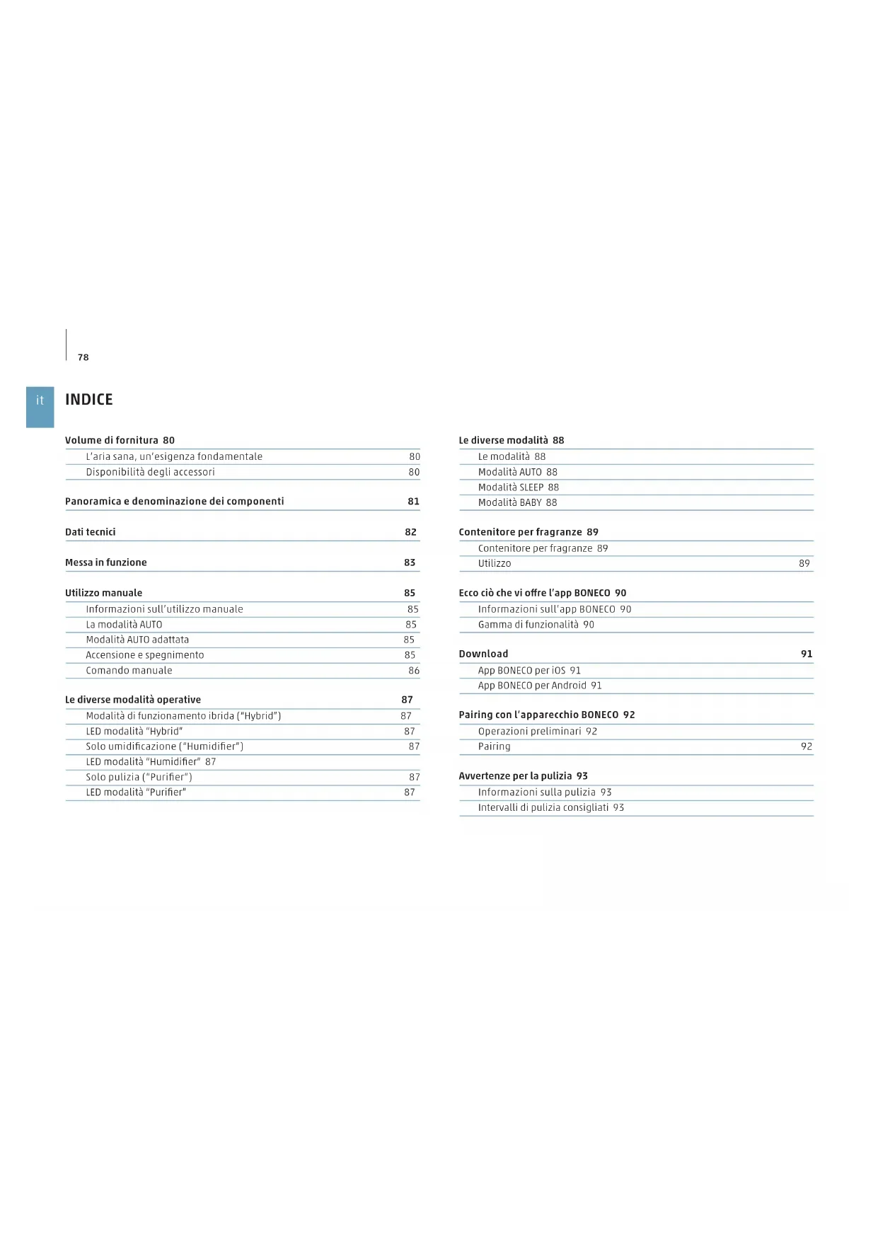 INDICE Le diverse modalità 88 Le modalità 88 Modalità AUTO 88 Modalità SLEEP 88 Modalità BABY 88 Contenitore per fragranze 89 Contenitore per fragranze 89 Utilizzo 89 Ecco ciò che vi ore l’app BONECO 90 Informazioni sull’app BONECO 90 Gamma di funzionalità 90 Download 91 App BONECO per iOS 91 App BONECO per Android 91 Pairing con l’apparecchio BONECO 92 Operazioni preliminari 92 Pairing 92 Avvertenze per la pulizia 93 Informazioni sulla pulizia 93 Intervalli di pulizia consigliati 93 Volume di fornitura 80 L’aria sana, un’esigenza fondamentale 80 Disponibilità degli accessori 80 Panoramica e denominazione dei componenti 81 Dati tecnici 82 Messa in funzione 83 Utilizzo manuale 85 Informazioni sull’utilizzo manuale 85 La modalità AUTO 85 Modalità AUTO adattata 85 Accensione e spegnimento 85 Comando manuale 86 Le diverse modalità operative 87 Modalità di funzionamento ibrida (“Hybrid”) 87 LED modalità “Hybrid” 87 Solo umidificazione (“Humidifier”) 87 LED modalità “Humidifier” 87 Solo pulizia (“Purifier”) 87 LED modalità “Purifier” 8779